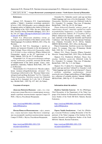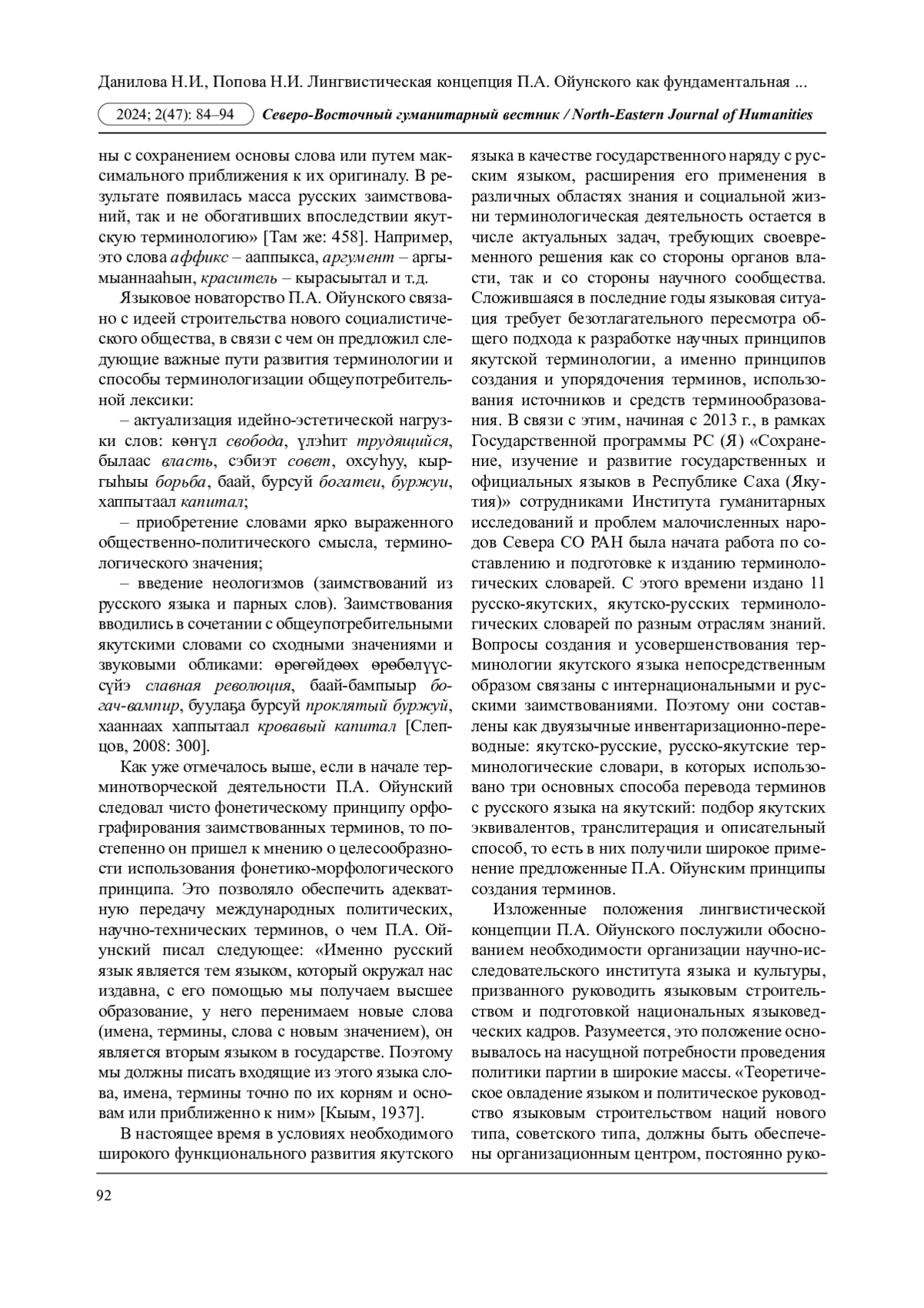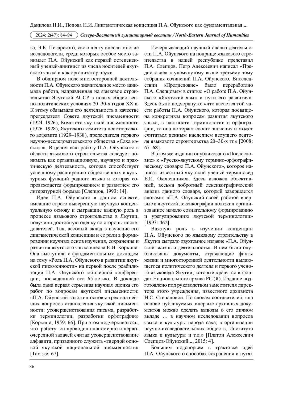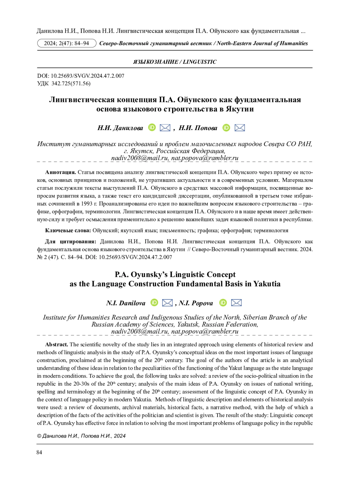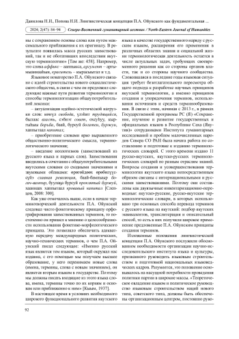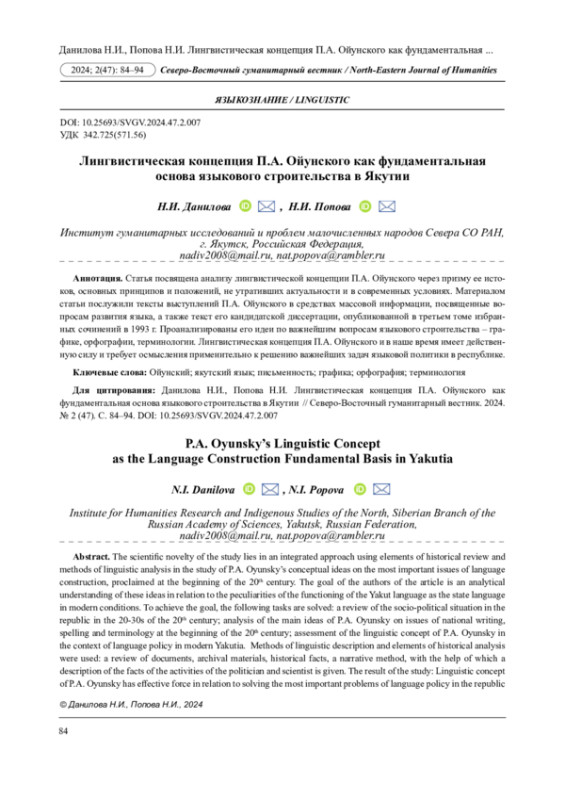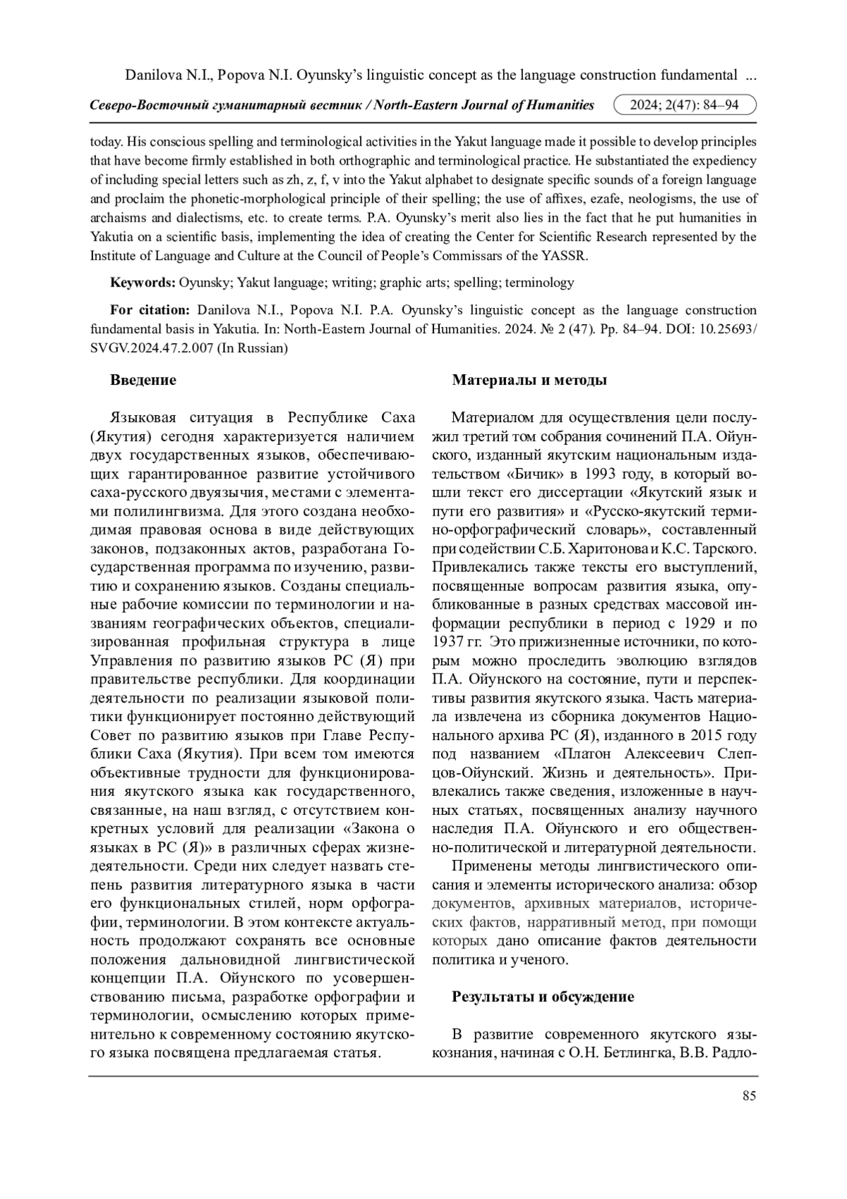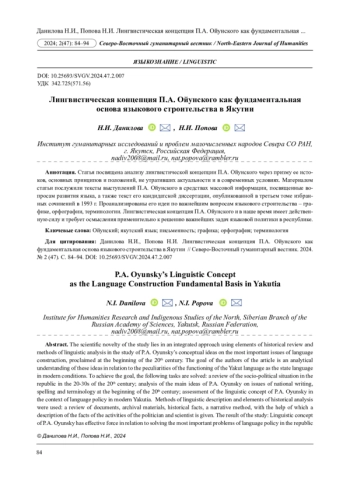 Статья посвящена анализу лингвистической концепции П. А. Ойунского через призму ее истоков, основных принципов и положений, не утративших актуальности и в современных условиях. Материалом статьи послужили тексты выступлений П. А. Ойунского в средствах массовой информации, посвященные вопросам развития языка, а также текст его кандидатской диссертации, опубликованной в третьем томе избранных сочинений в 1993 г. Проанализированы его идеи по важнейшим вопросам языкового строительства - графике, орфографии, терминологии. Лингвистическая концепция П. А. Ойунского и в наше время имеет действенную силу и требует осмысления применительно к решению важнейших задач языковой политики в республике.
