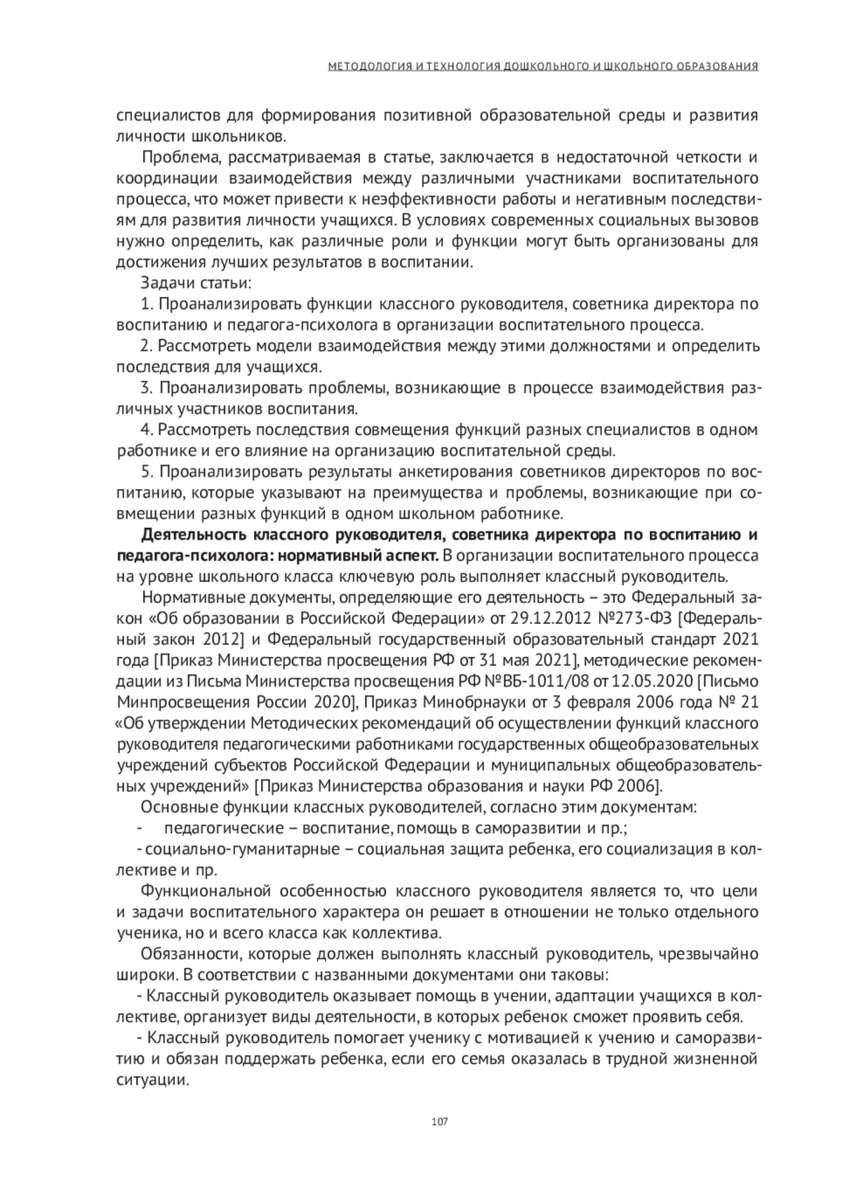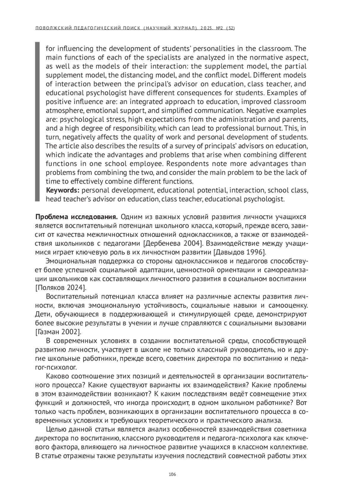 В статье рассматриваются особенности взаимодействия советника директора по воспитанию, классного руководителя, педагога-психолога как предпосылка влияния на развитие личности учащихся в классе. Анализируются основные функции каждого из специалистов в нормативном аспекте, а также модели их взаимодействия: модель дополнения, модель частичного дополнения, модель дистанцирования и конфликтная модель. Различные модели взаимодействия между советником директора по воспитанию, классным руководителем, педагогом-психологом имеют различные последствия для учащихся. Примерами положительного влияния являются: комплексный подход к воспитанию, улучшение атмосферы в классе, эмоциональная поддержка и упрощение коммуникации. Отрицательные примеры: психологическая нагрузка, высокие ожидания со стороны администрации и родителей, а также высокая степень ответственности, которая может привести к профессиональному выгоранию. Это, в свою очередь, негативно сказывается на качестве работы и личностном развитии учащихся. В статье также представлены результаты анкетирования советников директоров по воспитанию, которые указывают на преимущества и проблемы, возникающие при совмещении разных функций в одном школьном работнике. Анкетируемые отмечают больше преимуществ, чем проблем от совмещения, а основной проблемой считают нехватку времени для результативного совмещения разных функций.