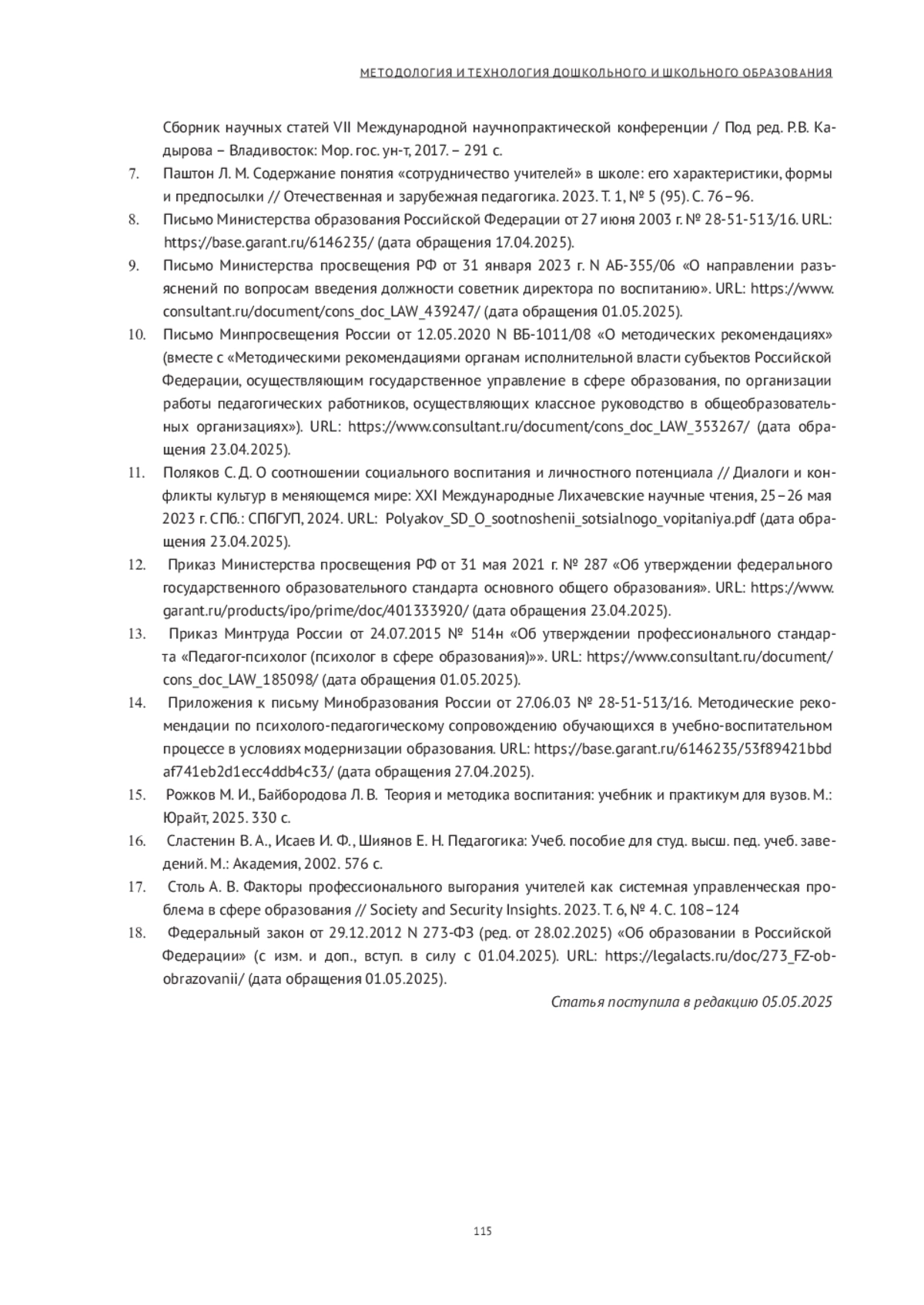 9. Письмо Министерства просвещения РФ от 31 января 2023 г. N АБ-355/06 “О направлении разъяснений по вопросам введения должности советник директора по воспитанию”. URL: https://www.consultant.ru/document/cons_doc_LAW_439247/(дата обращения 01.05.2025).