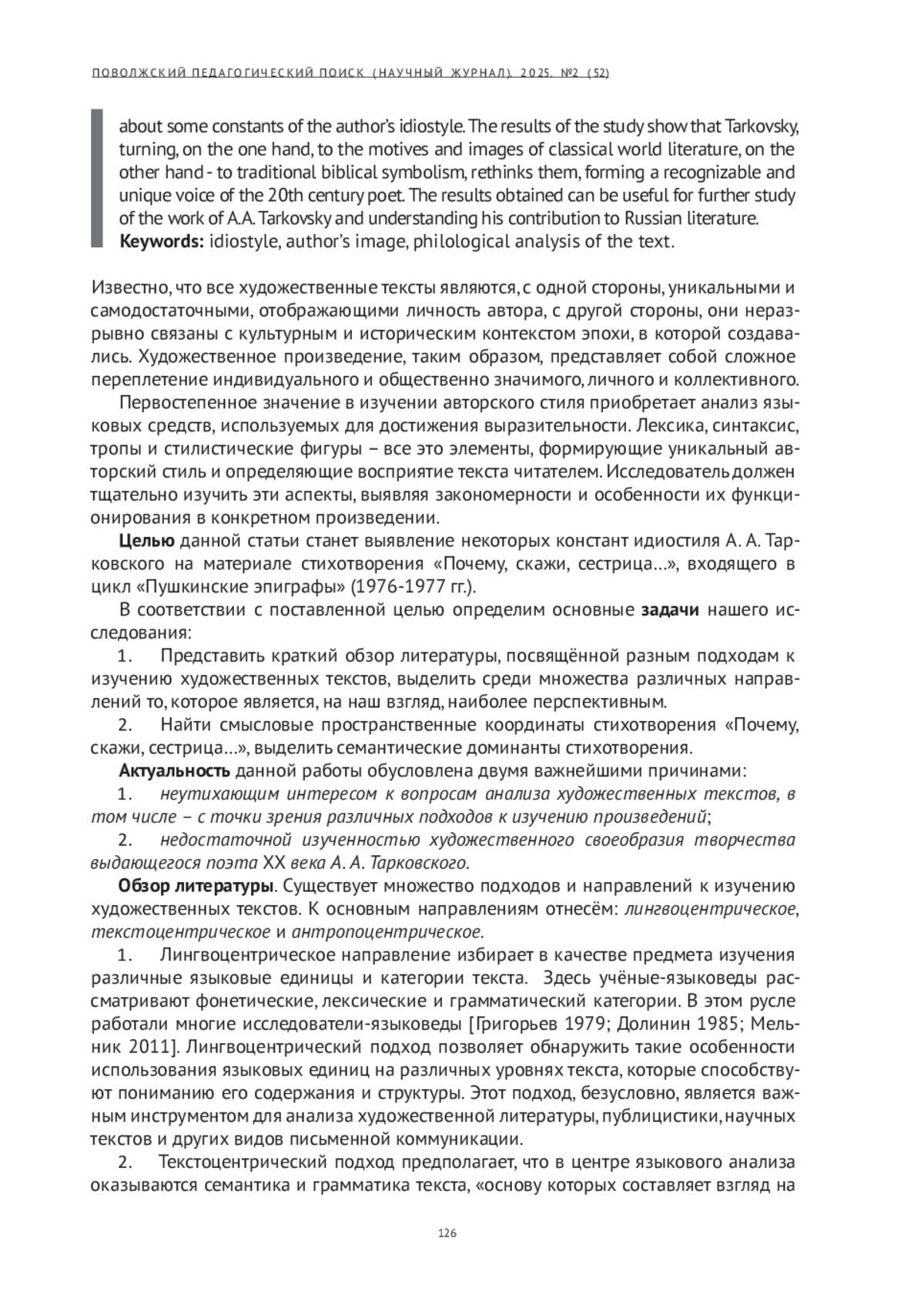 Идиостиль представляет собой уникальную систему лингвистических и стилистических особенностей, присущих конкретному автору и позволяющих выделить его творчество среди множества других. В данной работе предпринята попытка выявления некоторых ключевых элементов, формирующих индивидуальную манеру письма выдающегося мастера поэтического слова - А. А. Тарковского. Представлен анализ языковых средств стихотворения «Почему, скажи, сестрица…», которое входит в поэтический цикл «Пушкинские эпиграфы» (1976- 1977 гг.). При этом особое внимание уделено пространственным координатам стихотворения, анализ которых позволил сформулировать выводы о некоторых константах авторского идиостиля. Результаты исследования показывают, что Тарковский, обращаясь, с одной стороны, к мотивам и образам классической мировой литературы, с другой стороны - к традиционной библейской символике, переосмысливает их, формируя узнаваемый и неповторимый голос поэта XX века. Полученные результаты могут быть полезны для дальнейшего изучения творчества А. А. Тарковского и понимания его вклада в русскую литературу.