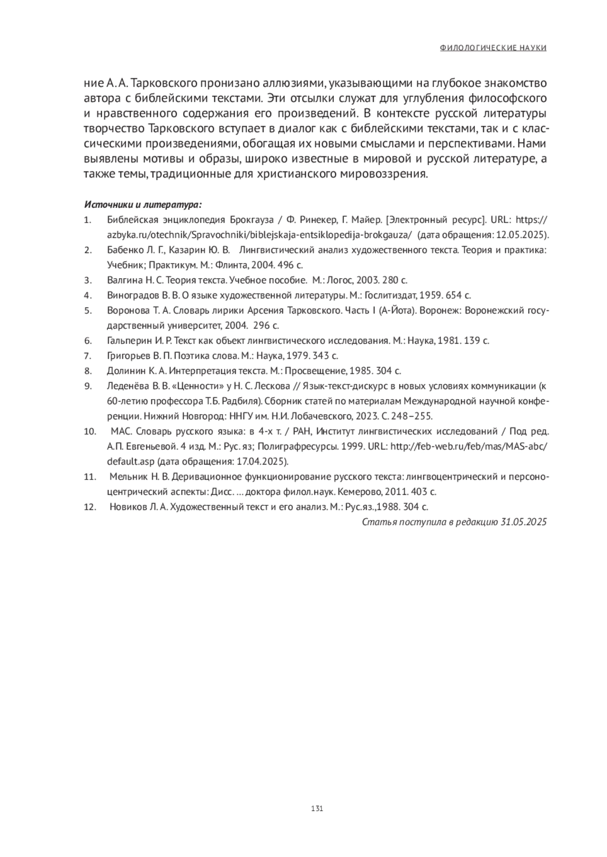 5. Воронова Т. А. Словарь лирики Арсения Тарковского. Часть I (А-Йота). Воронеж: Воронежский государственный университет, 2004. 296 с. EDN: QRBCXP