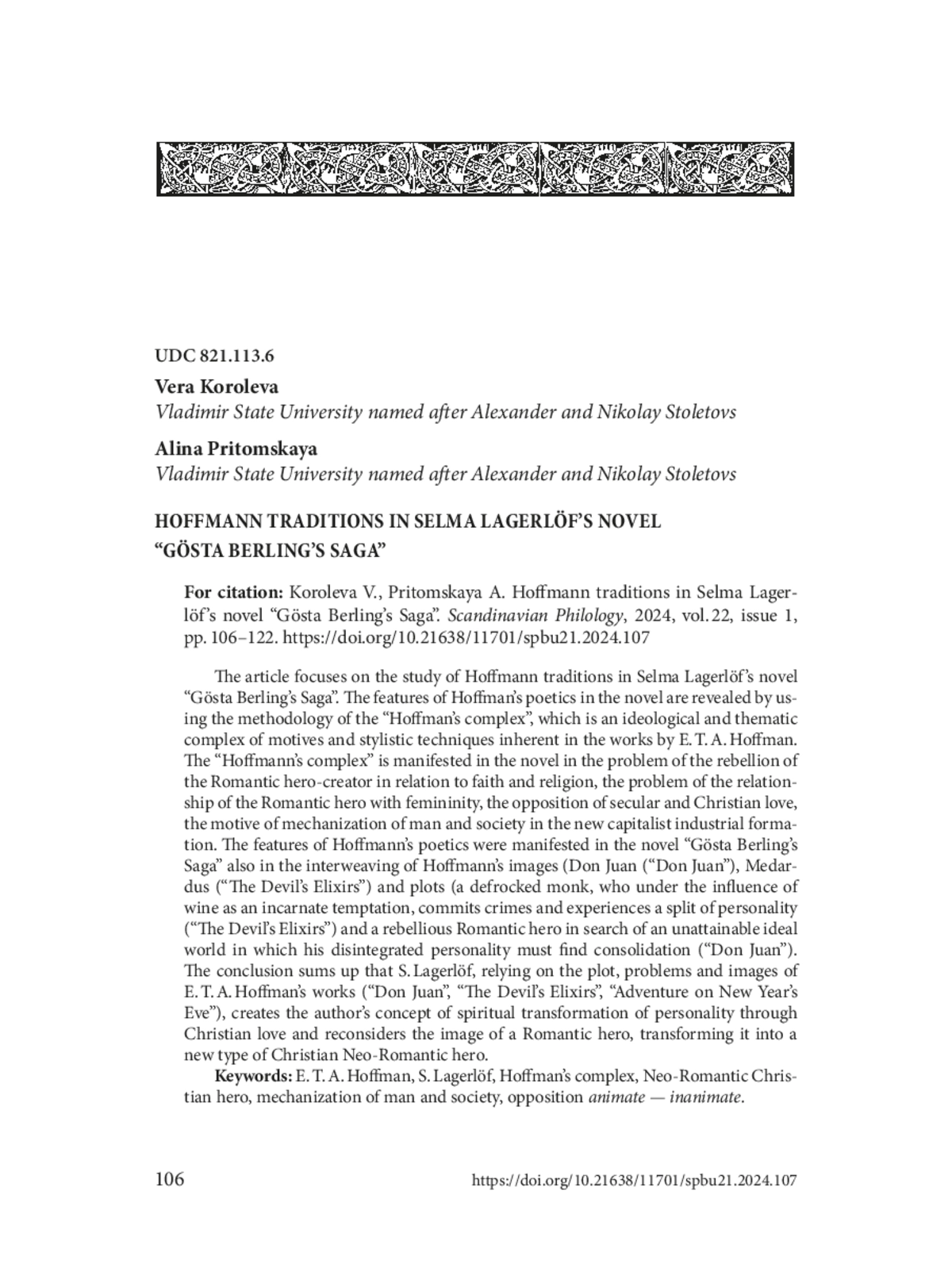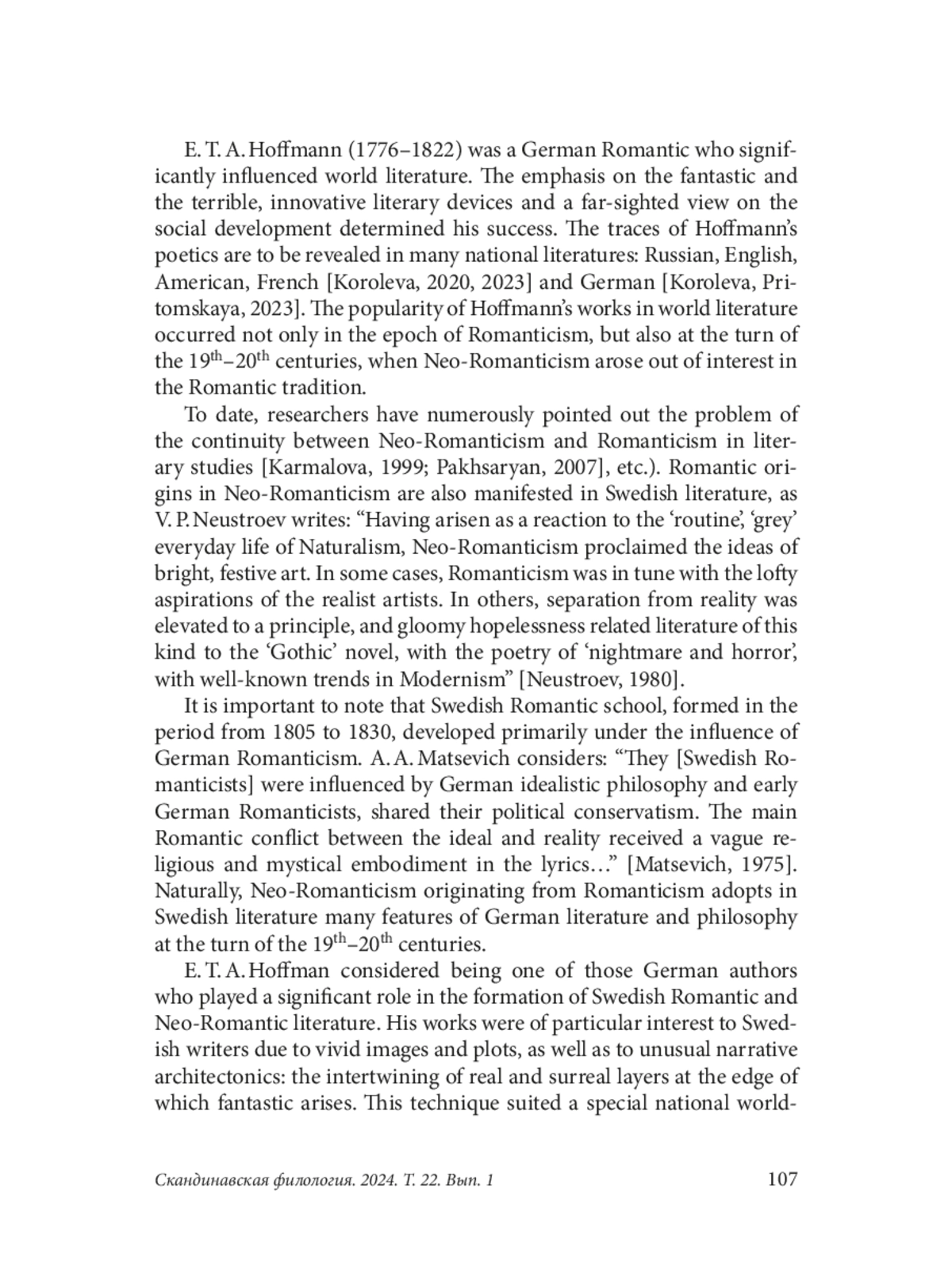E. T. A. Hoffmann (1776–1822) was a German Romantic who significantly influenced world literature. The emphasis on the fantastic and the terrible, innovative literary devices and a far-sighted view on the social development determined his success. The traces of Hoffmann’s poetics are to be revealed in many national literatures: Russian, English, American, French [Koroleva, 2020, 2023] and German [Koroleva, Pritomskaya, 2023]. The popularity of Hoffmann’s works in world literature occurred not only in the epoch of Romanticism, but also at the turn of the 19th–20th centuries, when Neo-Romanticism arose out of interest in the Romantic tradition.