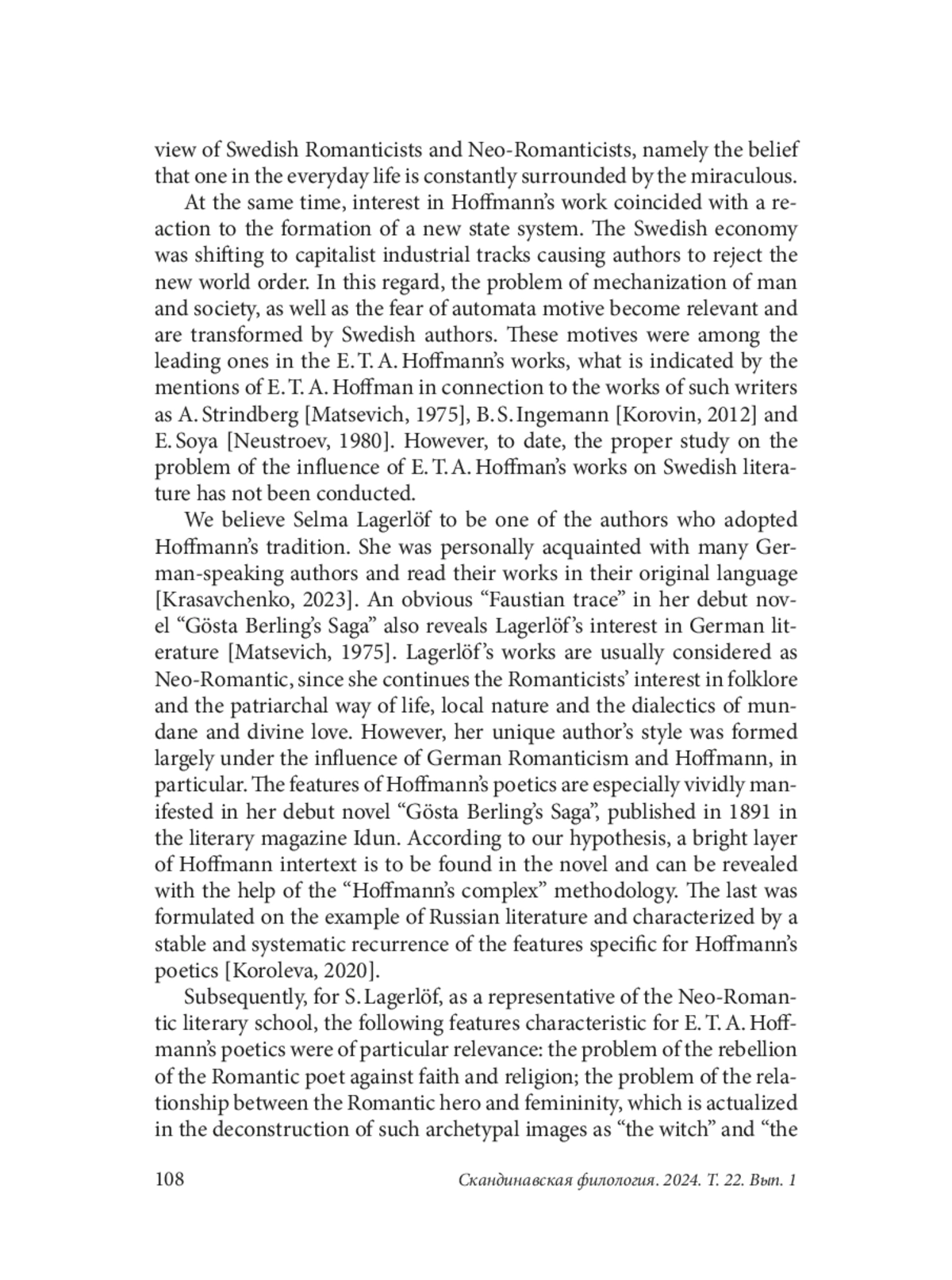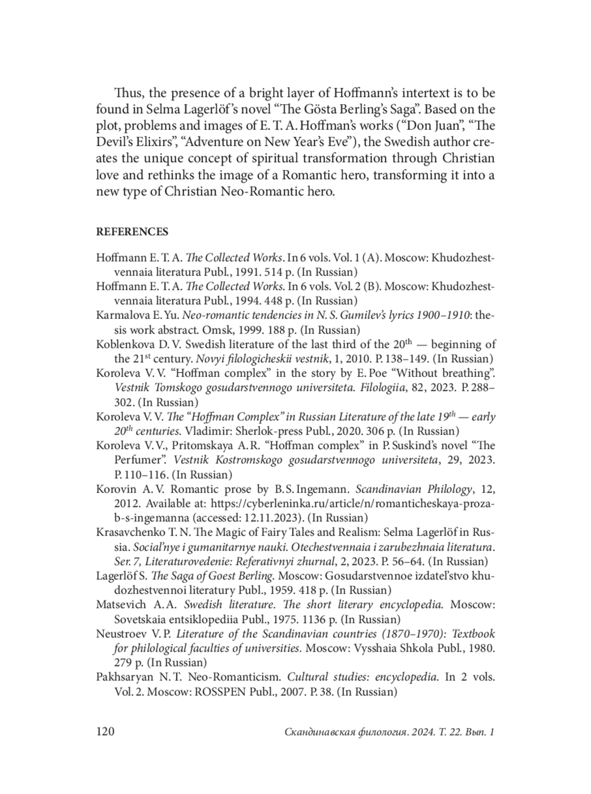 6. Koroleva V. V. The “Hoffman Complex” in Russian Literature of the late 19th - early 20th centuries. Vladimir: Sherlok-press Publ., 2020. 306 p. (In Russian).