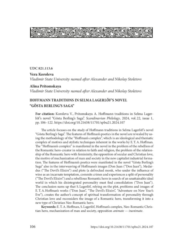The article focuses on the study of Hoffmann traditions in Selma Lagerlöf ’s novel “Gösta Berling’s Saga”. The features of Hoffman’s poetics in the novel are revealed by using the methodology of the “Hoffman’s complex”, which is an ideological and thematic complex of motives and stylistic techniques inherent in the works by E. T. A. Hoffman. The “Hoffmann’s complex” is manifested in the novel in the problem of the rebellion of the Romantic hero-creator in relation to faith and religion, the problem of the relationship of the Romantic hero with femininity, the opposition of secular and Christian love, the motive of mechanization of man and society in the new capitalist industrial formation. The features of Hoffmann’s poetics were manifested in the novel “Gösta Berling’s Saga” also in the interweaving of Hoffmann’s images (Don Juan (“Don Juan”), Medardus (“The Devil’s Elixirs”) and plots (a defrocked monk, who under the influence of wine as an incarnate temptation, commits crimes and experiences a split of personality (“The Devil’s Elixirs”) and a rebellious Romantic hero in search of an unattainable ideal world in which his disintegrated personality must find consolidation (“Don Juan”). The conclusion sums up that S. Lagerlöf, relying on the plot, problems and images of E. T. A. Hoffman’s works (“Don Juan”, “The Devil’s Elixirs”, “Adventure on New Year’s Eve”), creates the author’s concept of spiritual transformation of personality through Christian love and reconsiders the image of a Romantic hero, transforming it into a new type of Christian Neo-Romantic hero