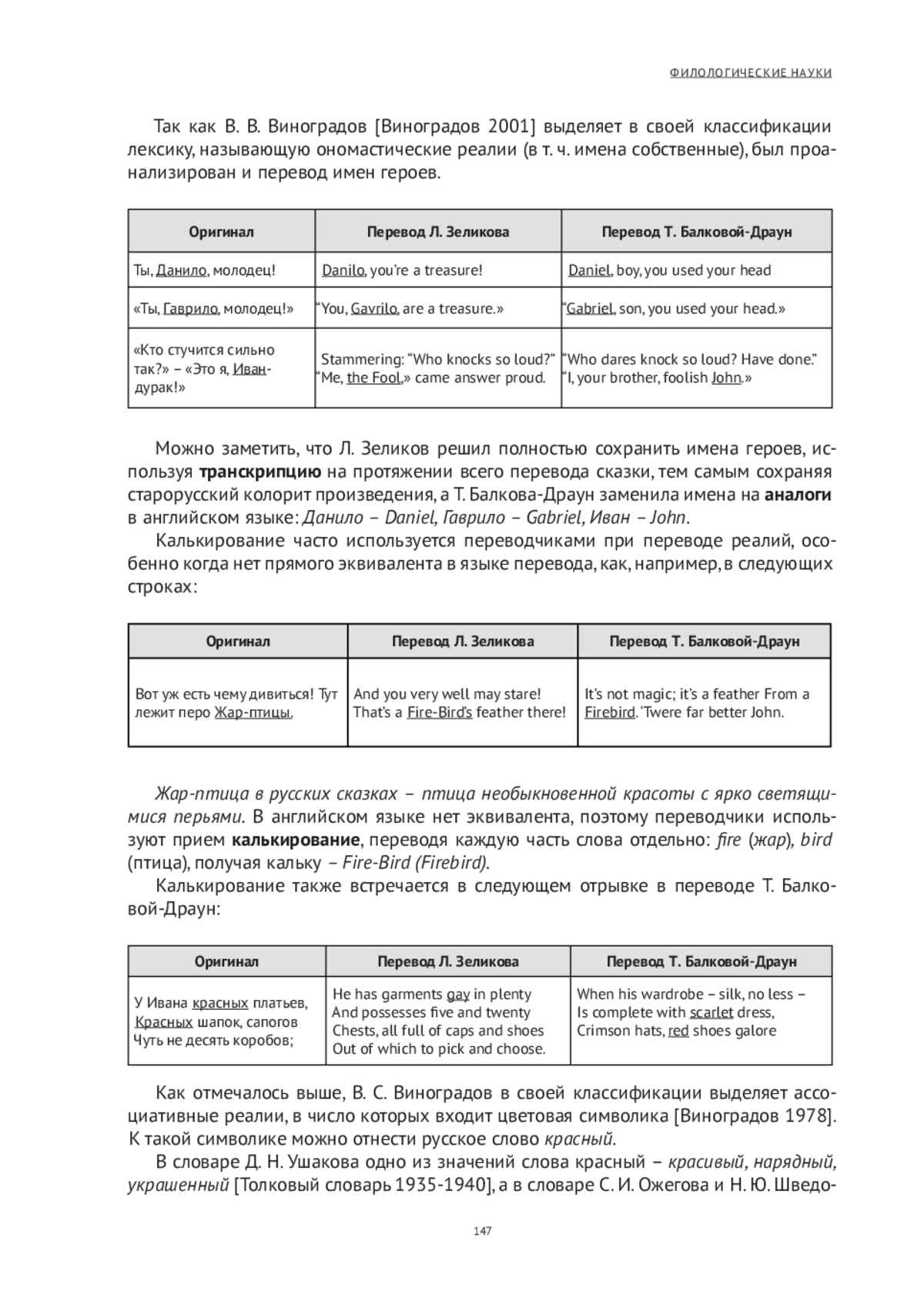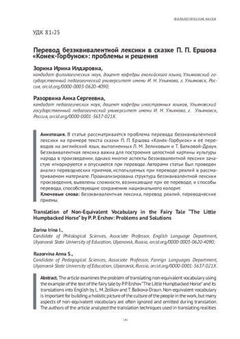 В статье рассматривается проблема перевода безэквивалентной лексики на примере текста сказки П. П. Ершова «Конёк-Горбунок» и её переводов на английский язык, выполненных Л. М. Зеликовым и Т. Балковой- Драун. Безэквивалентная лексика важна для построения целостной картины культуры народа в произведении, однако многие аспекты безэкввалентной лексики зачастую игнорируются и опускаются при переводе. Авторами статьи был проведен анализ переводческих приемов, используемых при переводе реалий в рассматриваемом материале. Проанализирована структура безэквивалентной лексики произведения, выявлены сложности, возникающие при ее переводе, и способы перевода, способствующие сохранению национального колорит.