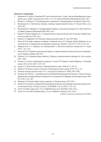 7. Панин В. В. Способы передачи метафоры в переводе сказки П. П. Ершова “Конёк-Горбунок” на английский язык // Современные исследования социальных проблем. 2016. № 3-1 (27). С.110-122.