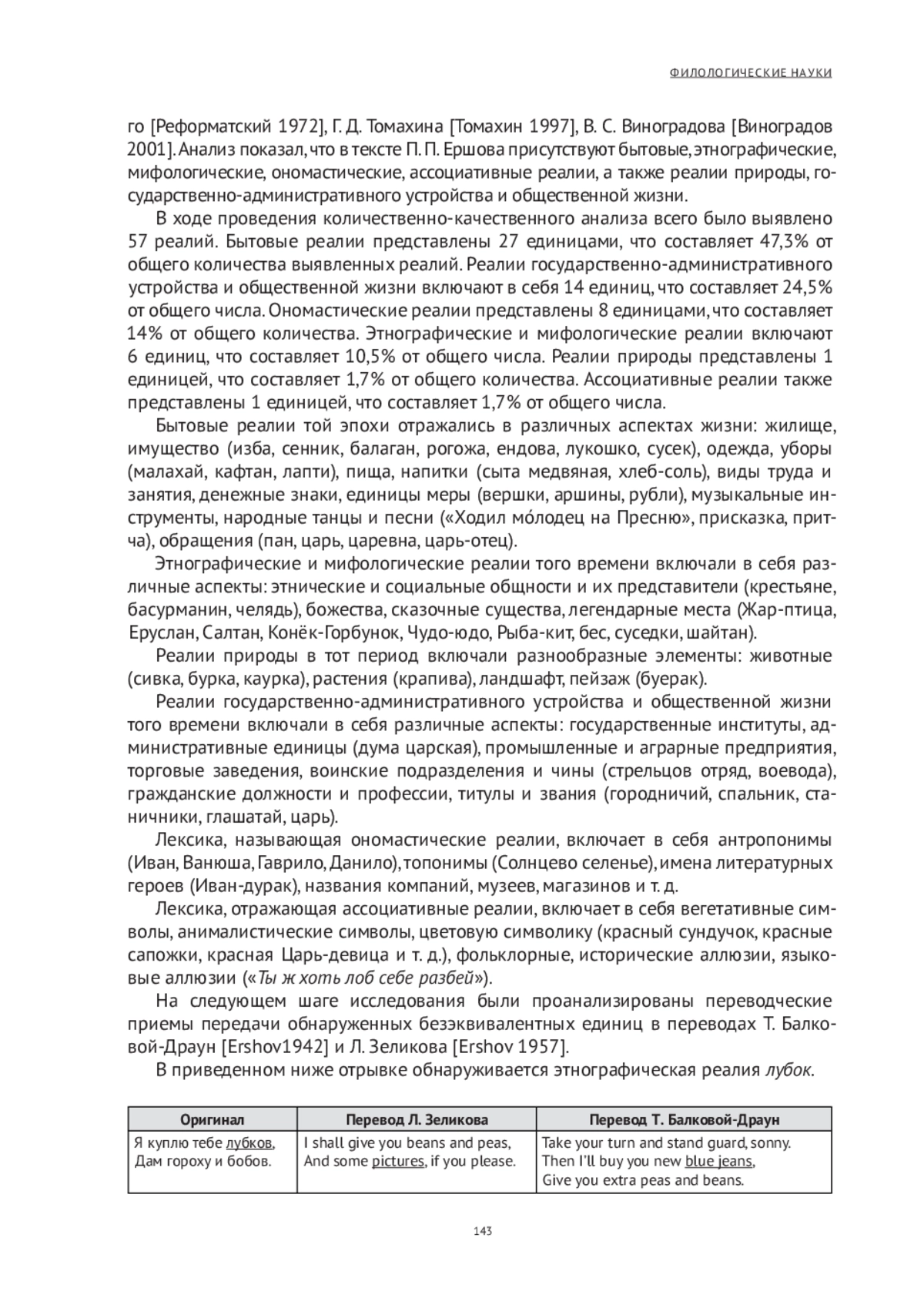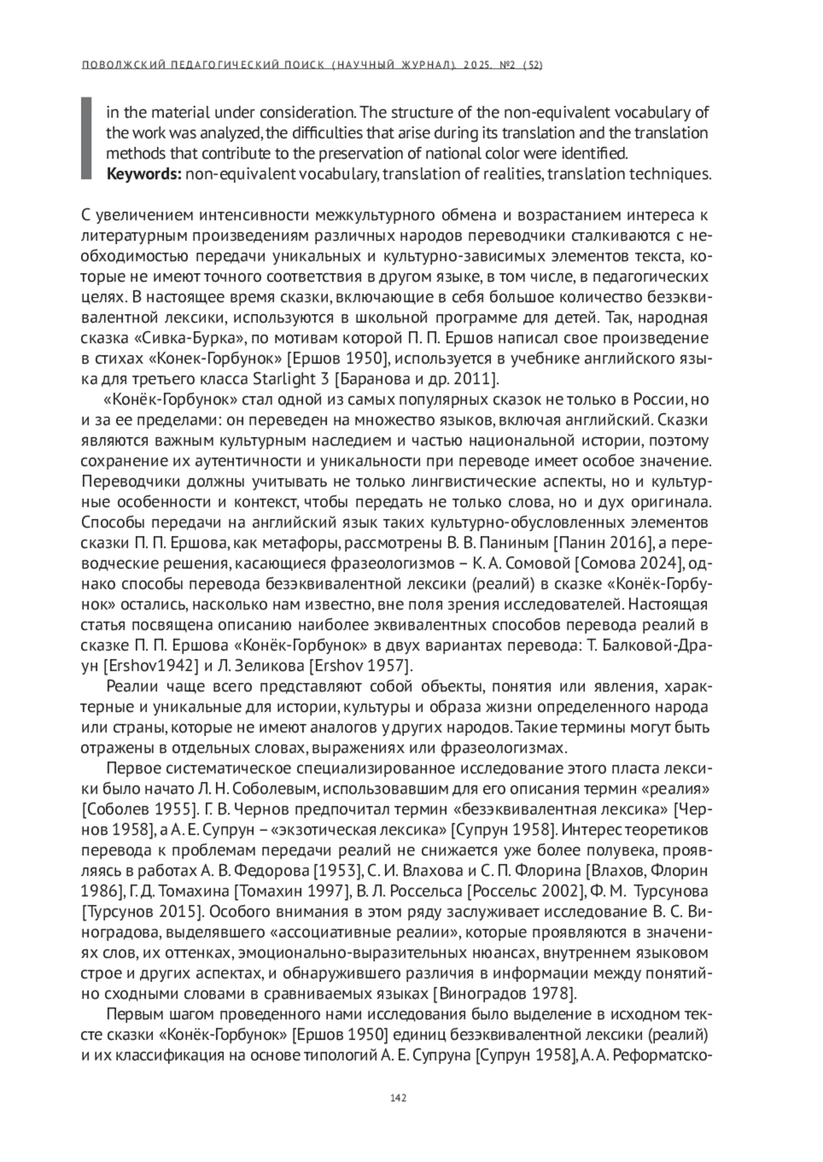 11. Сомова К. А. Анализ переводческих решений в сказке П. П. Ершова “Конёк-Горбунок” // Молодой ученый. № 16 (515). 2024. С. 143-147. EDN: CKZIHP