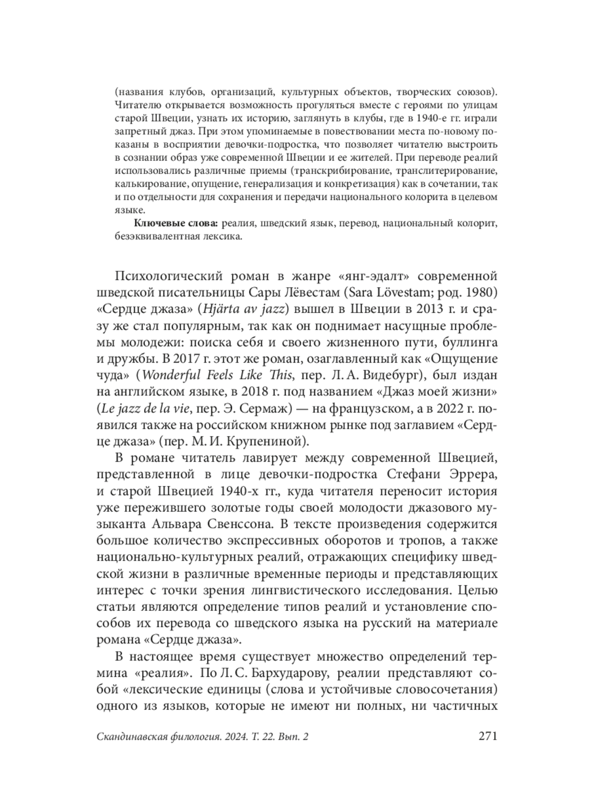 Роман современной шведской писательницы Сары Лёвестам «Сердце джаза» примечателен своей интересной композицией: в нем переплетаются два пласта бытия — прошлое и настоящее. Прошлое представлено воспоминаниями Альвара Свенссона о своем пути становления в качестве джазового музыканта. Пока в мире бушует Вторая мировая война, юный Альвар отправляется в Стокгольм, чтобы играть «музыку черных». На фоне его судьбы автор рисует всеобъемлющую картину шведского уклада жизни и развития еще запретного в ту пору музыкального направления. Любовь к джазу становится своеобразным мостом между прошлым и современностью, которая представлена историей школьницы Стеффи, подвергающейся нападкам со стороны сверстников и находящей утешение в музыке. В тексте произведения содержится большое количество экспрессивных оборотов и тропов, а также национально-культурных реалий, отражающих специфику шведской жизни и менталитета в различные временны ́ е периоды. Как правило, они представляют сложность для переводчика, так как зачастую не имеют точных аналогов в целевом языке. Следовательно, вопрос, касающийся специфики перевода реалий, является актуальным в рамках современной лингвистики. В большей степени в тексте произведения представлены топонимы (названия городов, населенных пунктов, площадей, улиц) и эргонимы (названия клубов, организаций, культурных объектов, творческих союзов). Читателю открывается возможность прогуляться вместе с героями по улицам старой Швеции, узнать их историю, заглянуть в клубы, где в 1940-е гг. играли запретный джаз. При этом упоминаемые в повествовании места по-новому показаны в восприятии девочки-подростка, что позволяет читателю выстроить в сознании образ уже современной Швеции и ее жителей. При переводе реалий использовались различные приемы (транскрибирование, транслитерирование, калькирование, опущение, генерализация и конкретизация) как в сочетании, так и по отдельности для сохранения и передачи национального колорита в целевом языке