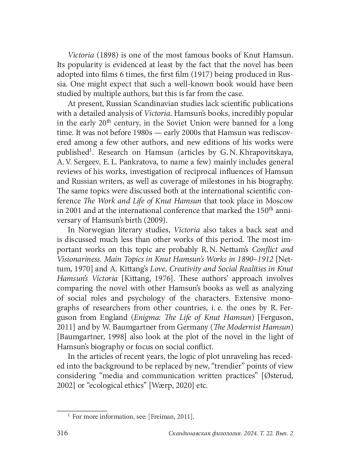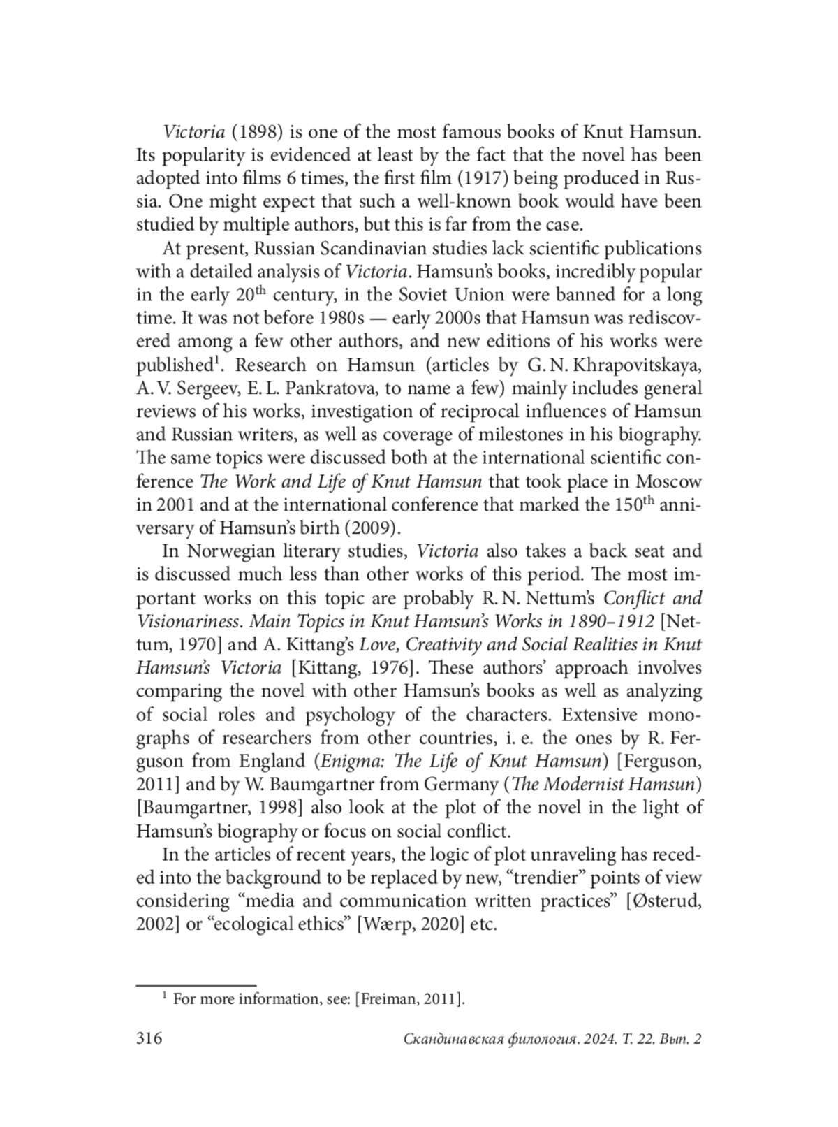 6. Freiman N. G. Hamsun’s publication in Russia. Vestnik Cherepovetskogo gosudarstvennogo universiteta, 29 (2), 2011. P. 97-101. (In Russian).