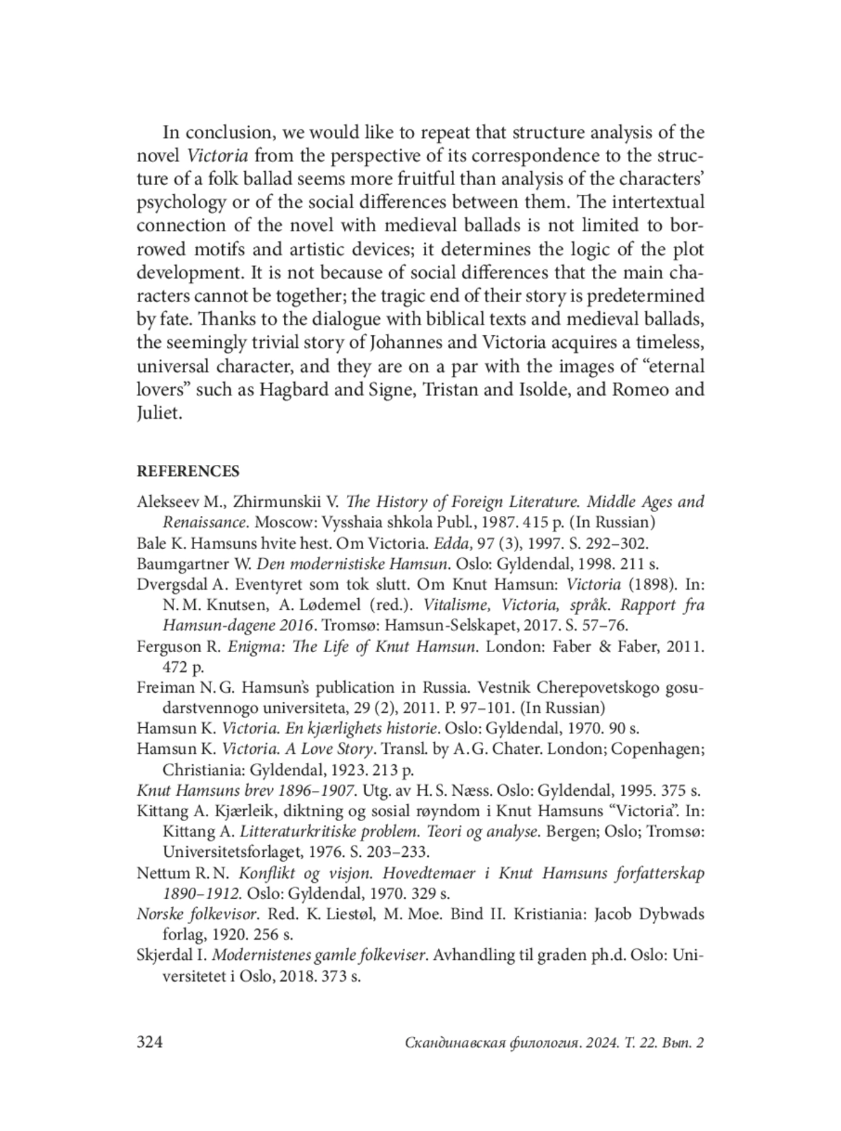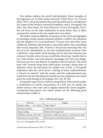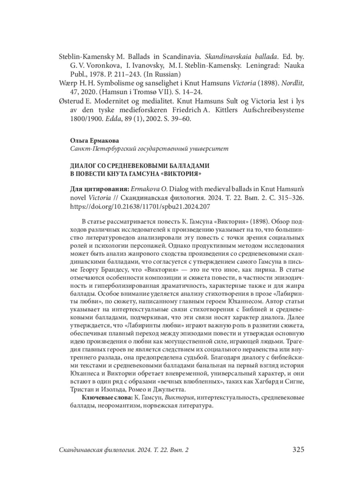 The article deals with K. Hamsun’s novel Victoria (1898). The author offers an overview of various researchers’ approaches to the work and points out that most literary scholars analyzed this story from the point of view of social roles and psychology of the characters. It is further argued that a productive method of research can be to analyze the genre similarities of the novel with medieval Scandinavian ballads, with the author relying on Hamsun’s own assertion that Victoria is nothing but a lyric. The article point at the features of the composition and plot of the story, which are also characteristic of the ballad genre, in particular, its episodic structure and hyperbolized dramatic quality of the plot. Special attention is paid to the analysis of the prose poem Labyrinths of Love, according to the plot written by the protagonist Johannes. The author of the article points out the intertextual connections in the poem with the Bible and medieval ballads, emphasizing that these connections have the character of dialogue. It is further argued that Labyrinths of Love plays an important role in the development of the plot, providing a smooth transition between the episodes of the story and affirming the main idea of the work about love as a powerful force that plays with people’s lives. The tragedy of the protagonists is not a consequence of their social inequality or inner discord, but is predetermined by fate. Due to the dialog with biblical texts and medieval ballads, the seemingly “banal” story of Johannes and Victoria acquires a timeless, universal character, and they become one of the long row of “eternal lovers” such as Hagbard and Signe, Tristan and Isolde, Romeo and Juliet