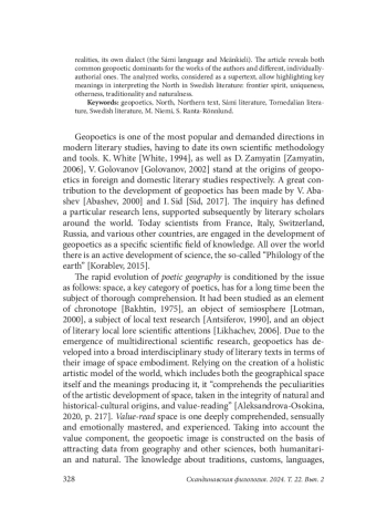 Geopoetics is one of the most popular and demanded directions in modern literary studies, having to date its own scientific methodology and tools. K. White [White, 1994], as well as D. Zamyatin [Zamyatin, 2006], V. Golovanov [Golovanov, 2002] stand at the origins of geopoetics in foreign and domestic literary studies respectively. A great contribution to the development of geopoetics has been made by V. Abashev [Abashev, 2000] and I. Sid [Sid, 2017]. The inquiry has defined a particular research lens, supported subsequently by literary scholars around the world. Today scientists from France, Italy, Switzerland, Russia, and various other countries, are engaged in the development of geopoetics as a specific scientific field of knowledge. All over the world there is an active development of science, the so-called “Philology of the earth” [Korablev, 2015].