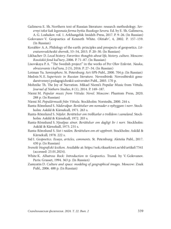 6. Galimova E. Sh. Northern text of Russian literature: research methodology. Severnyi tekst kak logosnaia forma bytiia Russkogo Severa. Ed. by E. Sh. Galimova, A. G. Loshakov. vol. 1. Arkhangelsk: Imidzh-Press, 2017. P. 9-26. (In Russian).