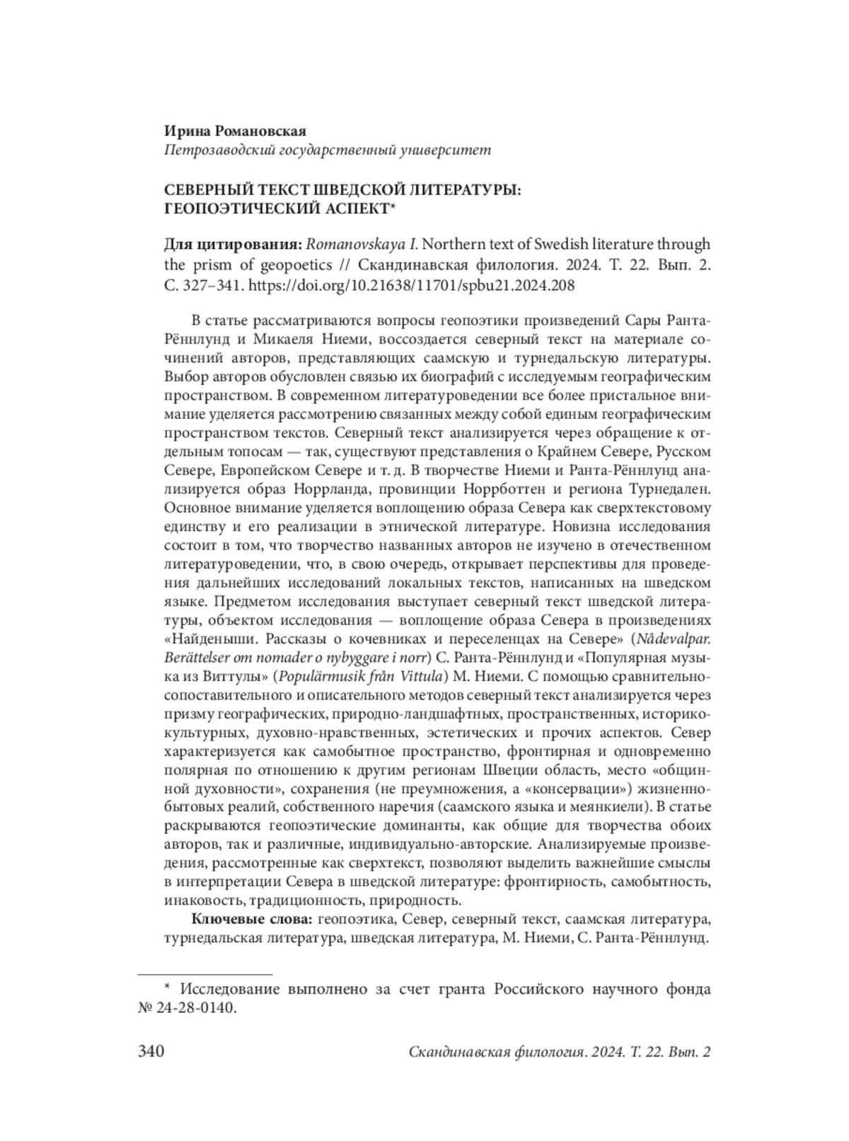 The article discusses the issues of geopoetics in the works of Sara Ranta-Rönnlund and Mikael Niemi, recreating the Northern text based on the writings of the authors representing the Sámi and the Tornedalian varieties of literature. The choice of authors is determined by the connection of their biographies with the researched geographical space. In contemporary literary studies increasing attention is paid to the examination of texts interconnected by a unified geographical space. The Northern text is analyzed through references to specific places — such as conceptions of the Far North, Russian North, European North etc. In the works of Niemi and Ranta-Rönnlund the image of Norrland, the province of Norrbotten, and the region of Tornedalen is comprehensively analyzed. The main focus is on embodying the image of the North as a supra-textual unity and its realization in ethnic literature. The novelty of the research lies in the fact that the works of these authors have not been studied in domestic literary studies, which in turn opens up prospects for further research on local texts written in Swedish. The subject of the research is the Northern text of Swedish literature, while the object is the embodiment of the image of the North in the work Nådevalpar. Berättelser om nomader o nybyggare i norr by S. Ranta- Rönnlund and Populärmusik från Vittula by M. Niemi. Using comparative and descriptive methods the Northern text is analyzed through geographical, natural-landscape, spatial, historical-cultural, spiritual-moral, aesthetic, and other aspects. The North is characterized as a unique space, frontier and at the same time polar in relation to other regions of Sweden, a place of “communal spirituality”, “preservation” (not multiplication, but “conservation”) of everyday realities, its own dialect (the Sámi language and Meänkieli). The article reveals both common geopoetic dominants for the works of the authors and different, individuallyauthorial ones. The analyzed works, considered as a supertext, allow highlighting key meanings in interpreting the North in Swedish literature: frontier spirit, uniqueness, otherness, traditionality and naturalness