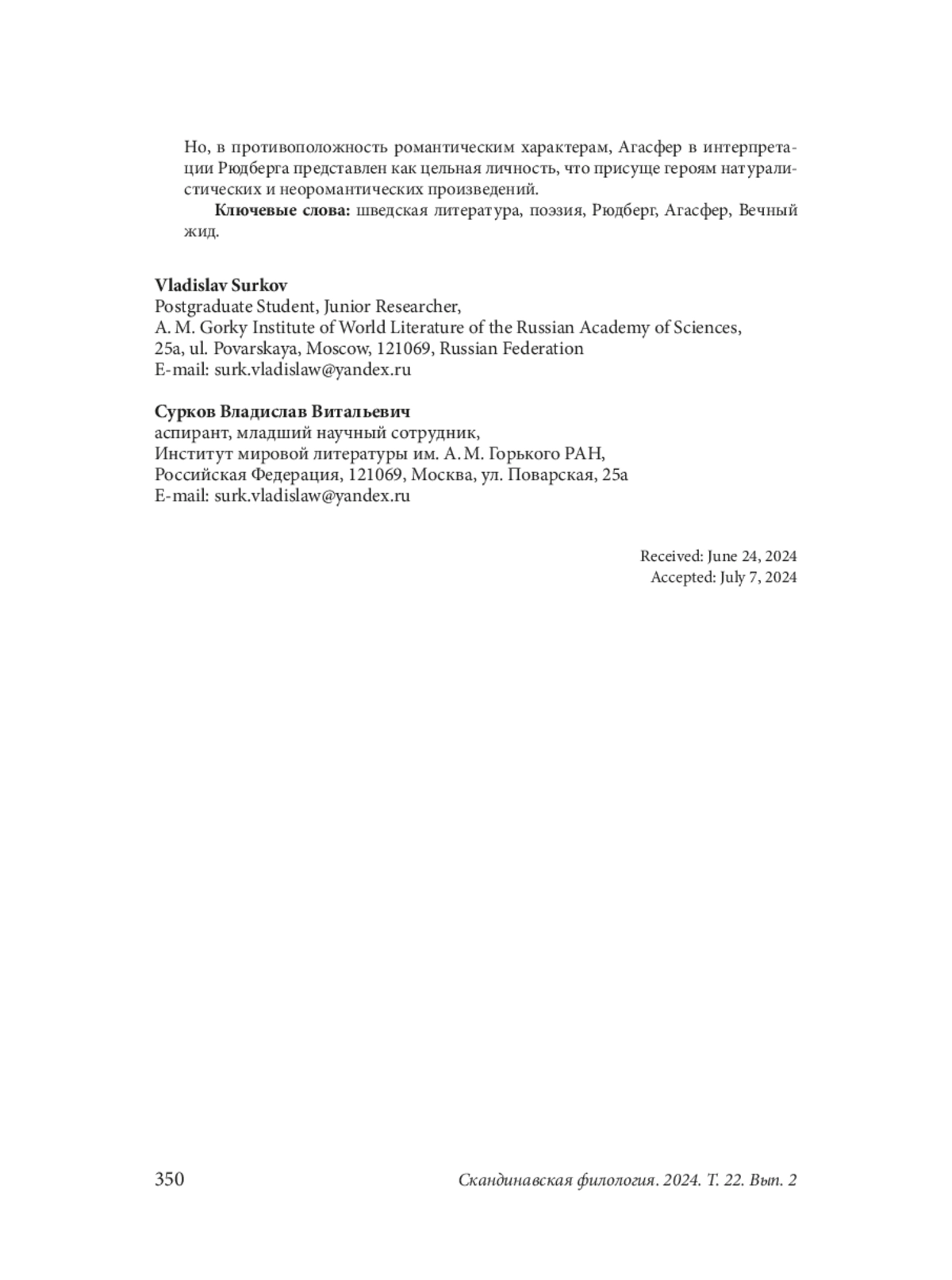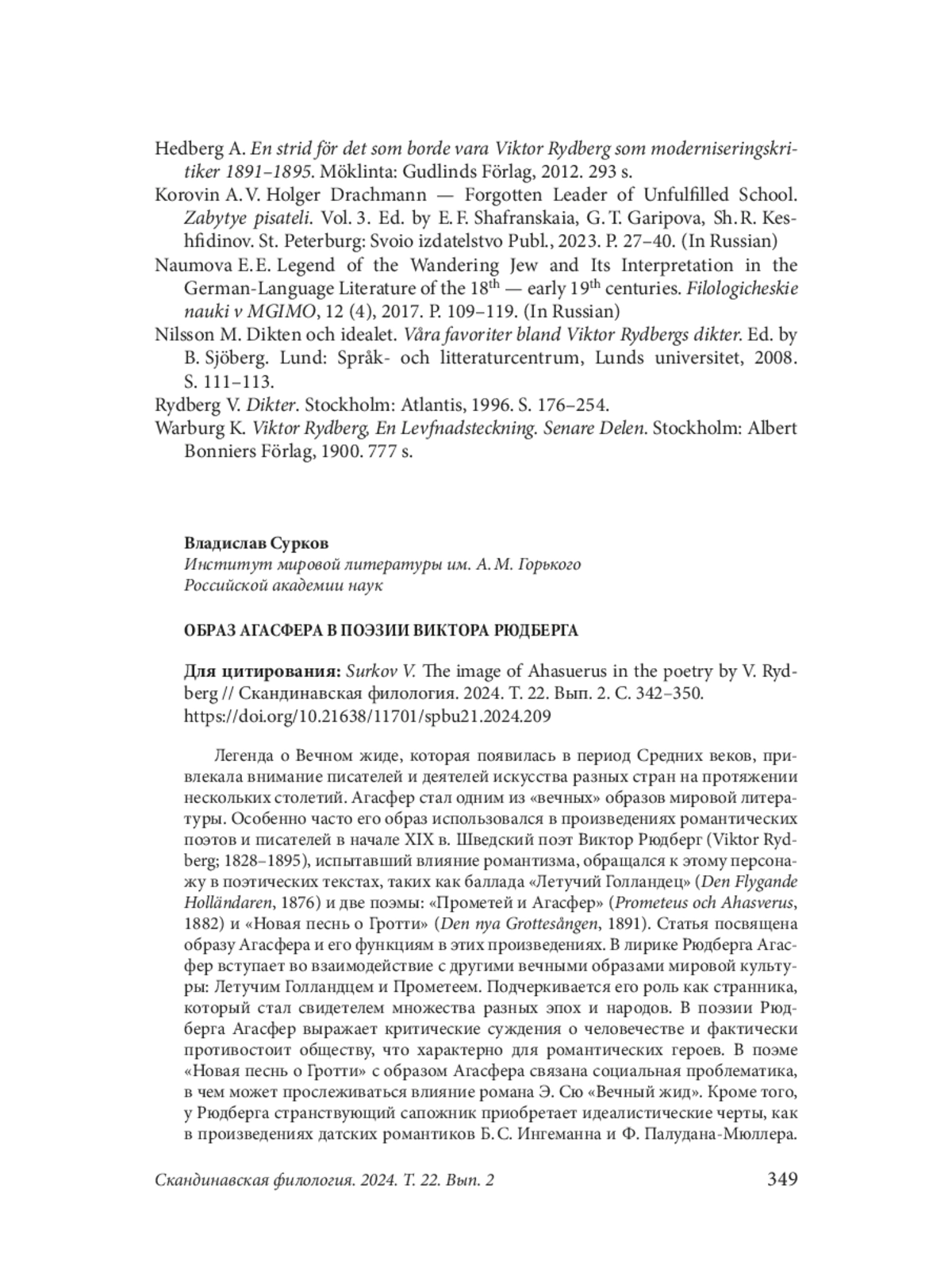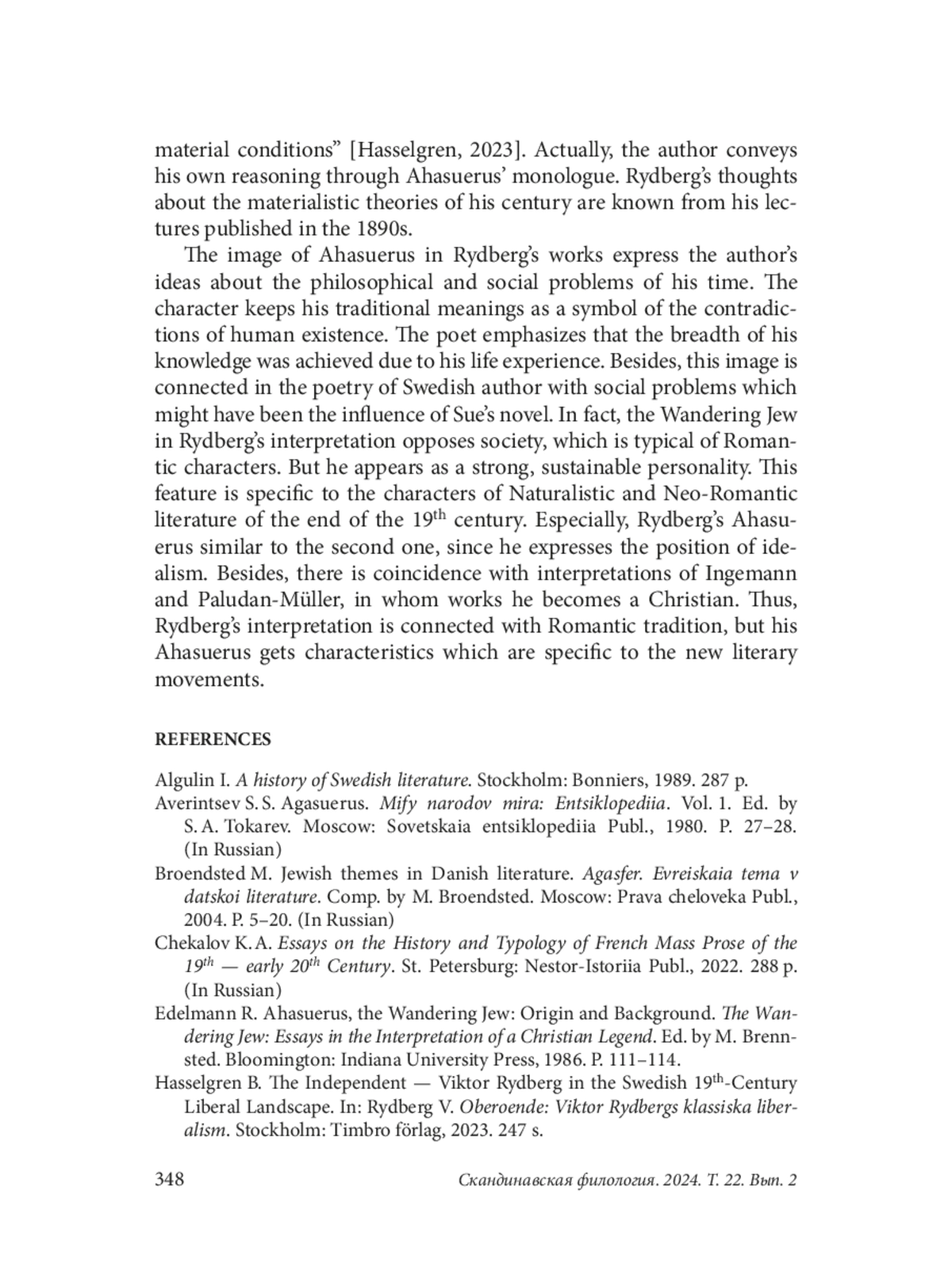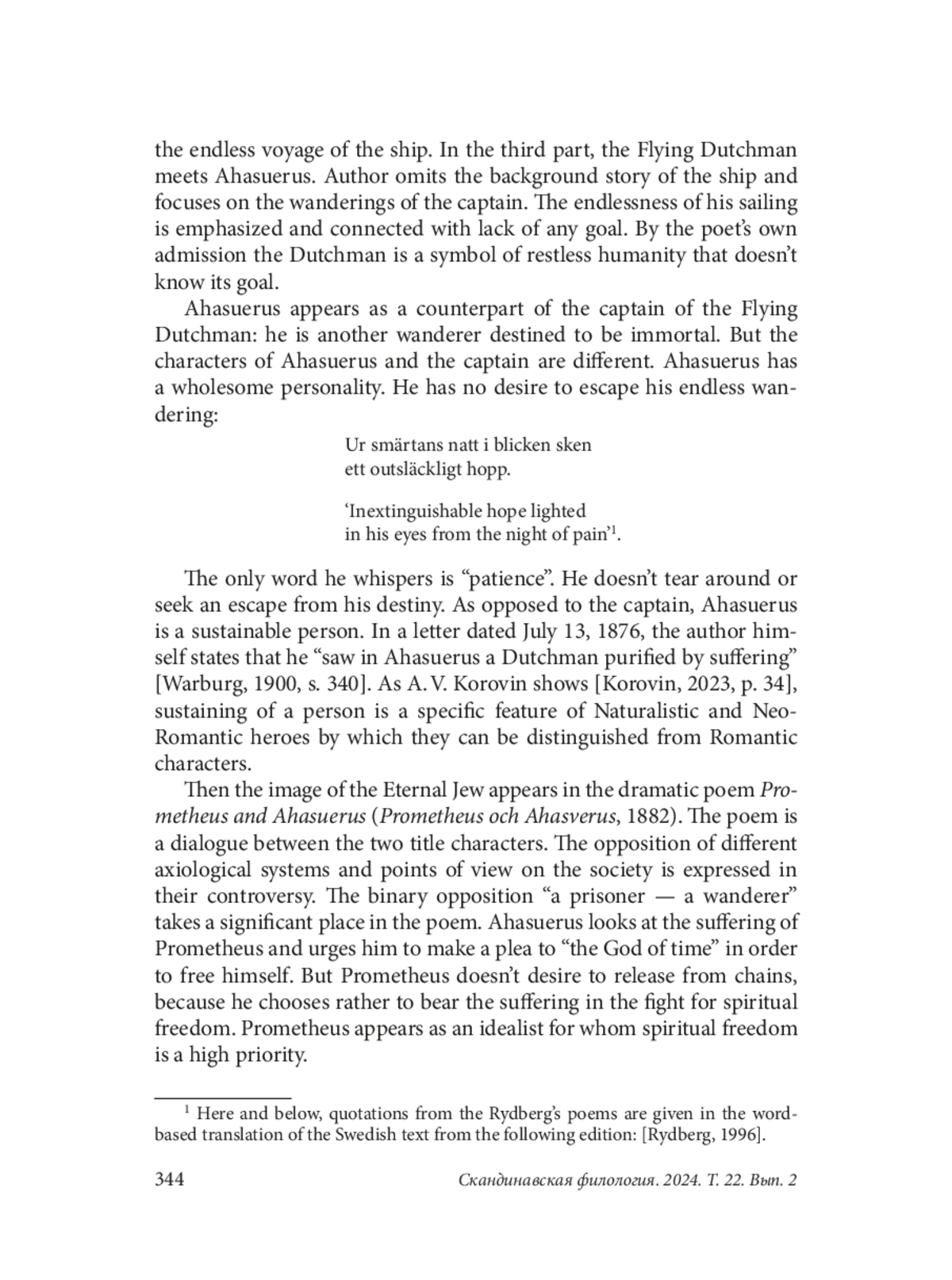 The legend of the Wandering Jew, which appeared in the Middle Ages, attracted the attention of writers and artists in many countries during several centuries. Ahasuerus has become one of the eternal images of world literature. This image was especially often used in the works of Romantic writers in the early 19th century. A Swedish poet Viktor Rydberg who was influenced by Romanticism used this character in several poetic works such as the ballad The Flying Dutchman (Den Flygande Holländaren, 1876) and two poems: Prometheus and Anasuerus (Prometeus och Ahasverus, 1882) and New Song of Grotti (Den nya Grottesången, 1891). In Rydberg’s lyrics, the Wandering Jew interacts with other eternal images of world culture such as the Flying Dutchman and Prometheus. His role as a stranger who witnessed a lot of different epochs and nations is emphasized in Rydberg’s poetry. Ahasuerus expresses critical judgments about modern people and actually opposes society which is the feature of Romantic characters. In the poem New Song of Grotti the image of Ahasuerus is connected with social problems. It might have been the influence of Sue’s novel The Wandering Jew. In contradiction to Romantic characters, Ahasuerus in Rydberg’s interpretation appears to be a sustainable person, which is specific to heroes of Naturalistic and Neo-Romantic Scandinavian works
