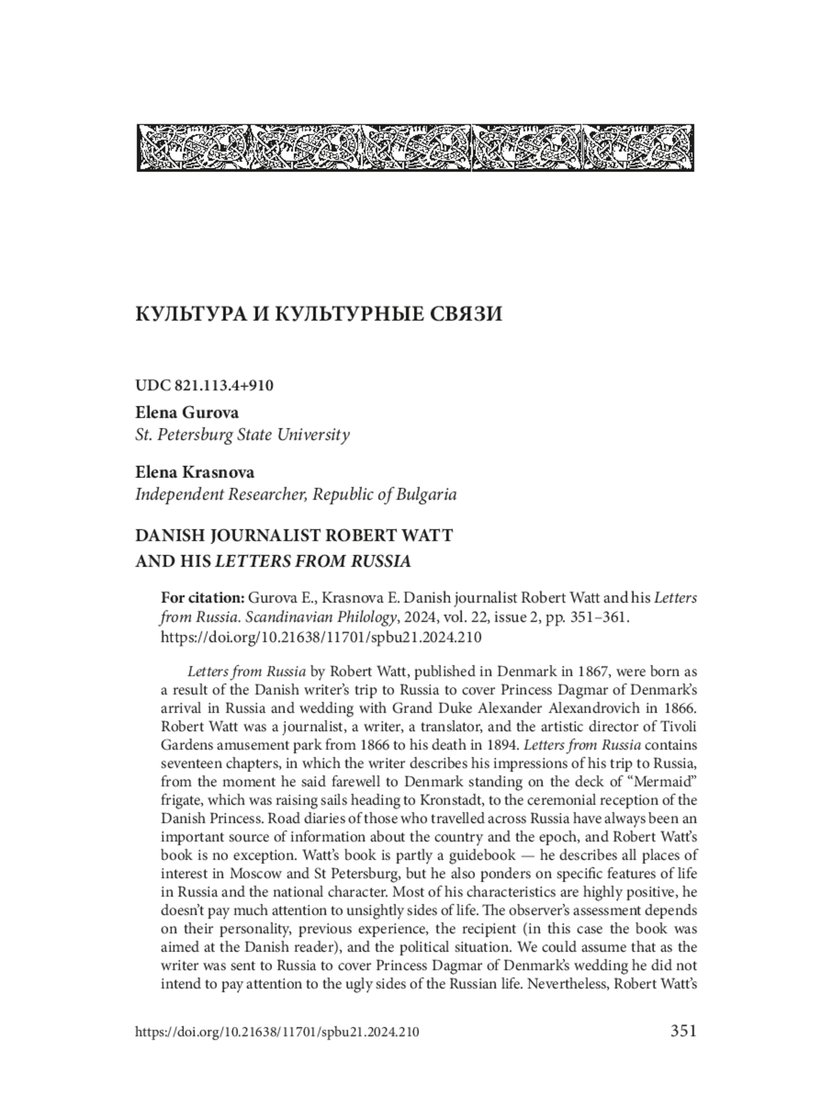 Letters from Russia by Robert Watt, published in Denmark in 1867, were born as a result of the Danish writer’s trip to Russia to cover Princess Dagmar of Denmark’s arrival in Russia and wedding with Grand Duke Alexander Alexandrovich in 1866. Robert Watt was a journalist, a writer, a translator, and the artistic director of Tivoli Gardens amusement park from 1866 to his death in 1894. Letters from Russia contains seventeen chapters, in which the writer describes his impressions of his trip to Russia, from the moment he said farewell to Denmark standing on the deck of “Mermaid” frigate, which was raising sails heading to Kronstadt, to the ceremonial reception of the Danish Princess. Road diaries of those who travelled across Russia have always been an important source of information about the country and the epoch, and Robert Watt’s book is no exception. Watt’s book is partly a guidebook — he describes all places of interest in Moscow and St Petersburg, but he also ponders on specific features of life in Russia and the national character. Most of his characteristics are highly positive, he doesn’t pay much attention to unsightly sides of life. The observer’s assessment depends on their personality, previous experience, the recipient (in this case the book was aimed at the Danish reader), and the political situation. We could assume that as the writer was sent to Russia to cover Princess Dagmar of Denmark’s wedding he did not intend to pay attention to the ugly sides of the Russian life. Nevertheless, Robert Watt’s book, unknown to a wide audience in Denmark and Russia, is an important cultural monument which supplements the history of relations between Denmark and Russia