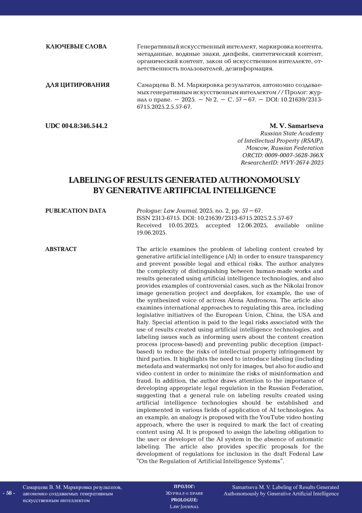 В статье рассматривается проблема маркировки контента, созданного генеративным искусственным интеллектом (ИИ), с целью обеспечения прозрачности и предотвращения возможных правовых и этических рисков. Автор анализирует сложность разграничения произведений, созданных человеком, и результатов, сгенерированных с помощью технологий искусственного интеллекта, а также приводит примеры спорных случаев, таких как проект по генерации изображений Николая Иронова и дипфейки, например, использование синтезированного голоса актрисы Алены Андроновой. В статье изучаются и международные подходы к регулированию этой области, включая законодательные инициативы Европейского Союза, Китая, США и Италии. Особое внимание уделено юридическим рискам, связанным с использованием результатов, созданных при помощи технологий искусственного интеллекта, и таким вопросам маркировки, как информирование пользователей о процессе создания контента (process-based) и предотвращение введения общественности в заблуждение (impact-based) для снижения рисков нарушения интеллектуальных прав третьих лиц. Подчеркивается необходимость внедрения маркировки (в том числе метаданных и водяных знаков) не только для изображений, но и для аудио- и видеоконтента, чтобы минимизировать риски дезинформации и мошенничества. Кроме того, автор обращает внимание на важность разработки соответствующего правового регулирования в Российской Федерации, предлагая закрепить общее правило о маркировке результатов, создаваемых с использованием технологий искусственного интеллекта, и внедрить его в различные сферы применения технологий ИИ. В качестве примера предлагается аналогия с подходом видеохостинга YouTube, где пользователь обязан отмечать факт создания контента с использованием ИИ. Предлагается закрепить обязанность по маркировке за пользователем или разработчиком системы ИИ в случае отсутствия автоматической маркировки. В статье также приводятся конкретные предложения по разработке нормативных положений для включения в проект Федерального закона «О регулировании систем искусственного интеллекта».