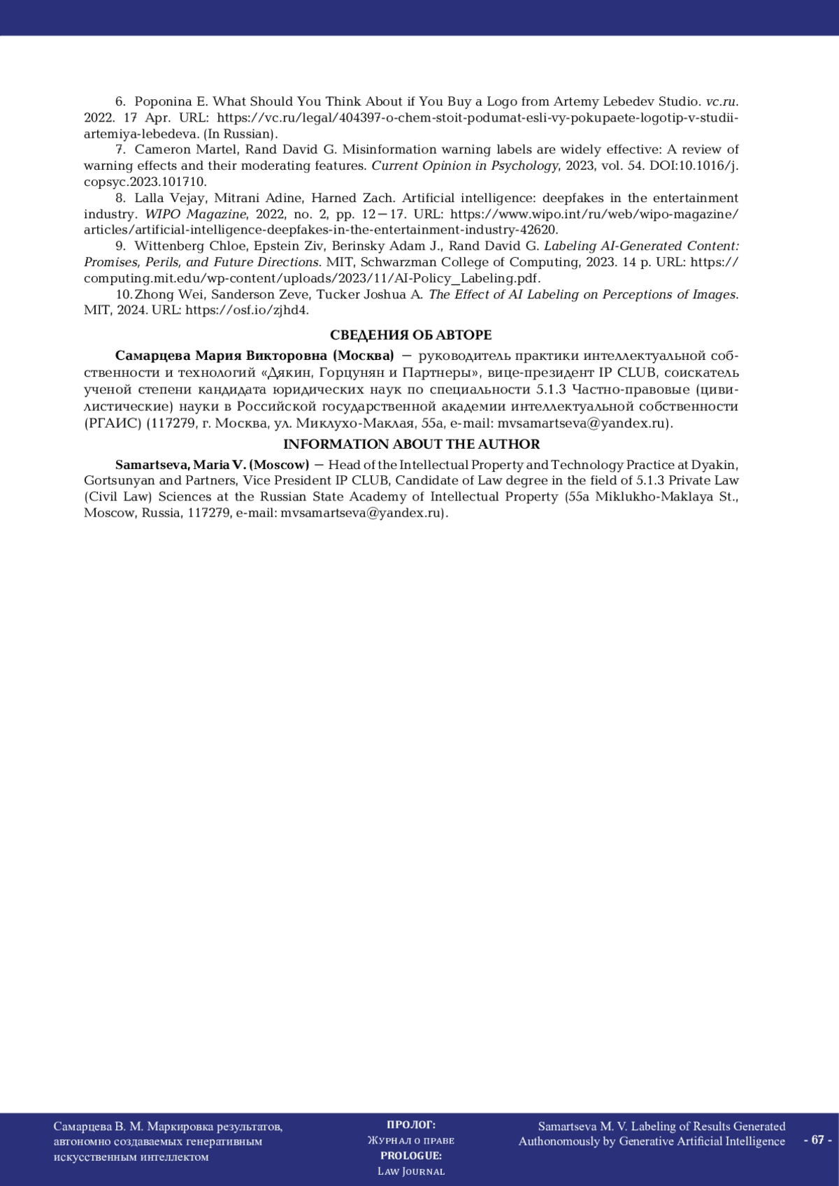 2. Каспарьянц Д. Маркировка контента, сгенерированного искусственным интеллектом. Обзор // Научно-технический центр ФГУП “ГРЧЦ”. - URL: https://rdc.grfc.ru/2025/04/ai_content/.