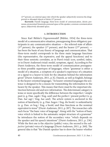 Since Karl Bühler’s Organonmodell [Bühler, 1934] the three-term model of a communicative situation, presupposing three obligatory participants in any communicative situation — the referred state of affairs (3rd person), the speaker (1st person), and the hearer (2nd person), — has been the basis of any theory of language and communication. That three-term model corresponds to the three main language functions (the representative, the expressive, and the appeal functions) and to their three semiotic correlates, as in Piers’s triad: icon, symbol, index, or in Durst-Andersen’s triad: model, symptom, signal. According to Per Durst-Andersen, the three-term model of communication presupposes three possible supertypes of languages, where “grammar is either a model of a situation, a symptom of a speaker’s experience of a situation or a signal to a hearer to look for the situation behind the information given” [Durst-Andersen, 2011, p. X]. Danish, as well as English, belongs to the hearer-oriented languages.