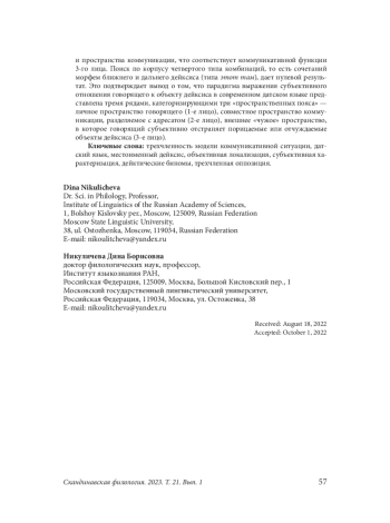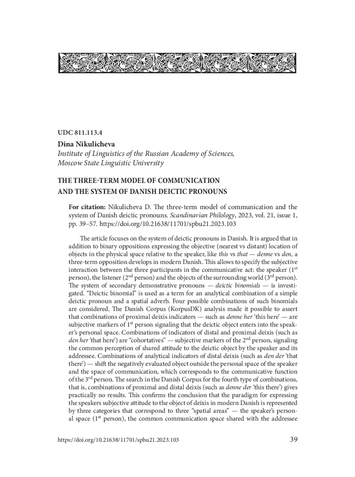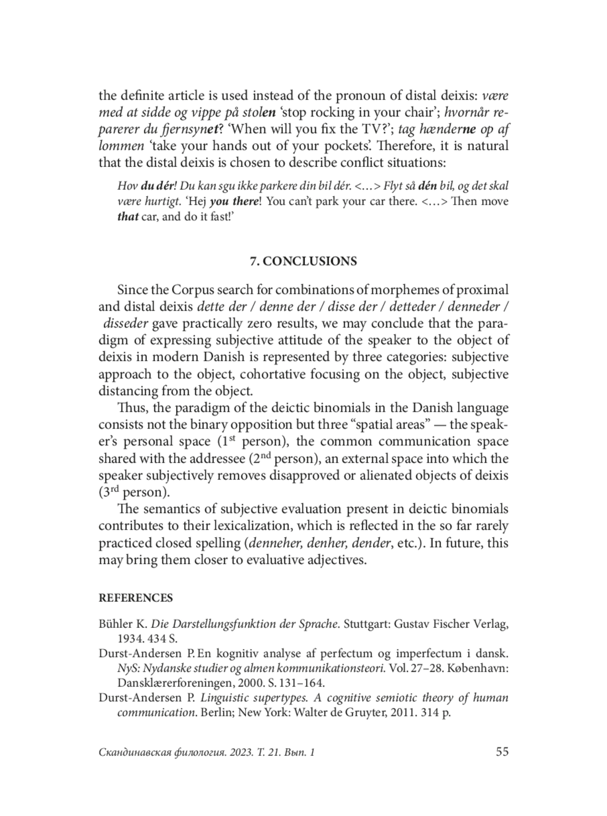 The article focuses on the system of deictic pronouns in Danish. It is argued that in addition to binary oppositions expressing the objective (nearest vs distant) location of objects in the physical space relative to the speaker, like this vs that — denne vs den, a three-term opposition develops in modern Danish. This allows to specify the subjective interaction between the three participants in the communicative act: the speaker (1 st person), the listener (2 nd person) and the objects of the surrounding world (3 rd person). The system of secondary demonstrative pronouns — deictic binomials — is investigated. “Deictic binomial” is used as a term for an analytical combination of a simple deictic pronoun and a spatial adverb. Four possible combinations of such binomials are considered. The Danish Corpus (KorpusDK) analysis made it possible to assert that combinations of proximal deixis indicators — such as denne her ‘this here’ — are subjective markers of 1 st person signaling that the deictic object enters into the speaker’s personal space. Combinations of indicators of distal and proximal deixis (such as den her ‘that here’) are “cohortatives” — subjective markers of the 2 nd person, signaling the common perception of shared attitude to the deictic object by the speaker and its addressee. Combinations of analytical indicators of distal deixis (such as den der ‘that there’) — shift the negatively evaluated object outside the personal space of the speaker and the space of communication, which corresponds to the communicative function of the 3 rd person. The search in the Danish Corpus for the fourth type of combinations, that is, combinations of proximal and distal deixis (such as denne der ‘this there’) gives practically no results. This confirms the conclusion that the paradigm for expressing the speakers subjective attitude to the object of deixis in modern Danish is represented by three categories that correspond to three “spatial areas” — the speaker’s personal space (1st person), the common communication space shared with the addressee (2nd person), an external space into which the speaker subjectively removes the disapproved or alienated objects of deixis (3rd person)