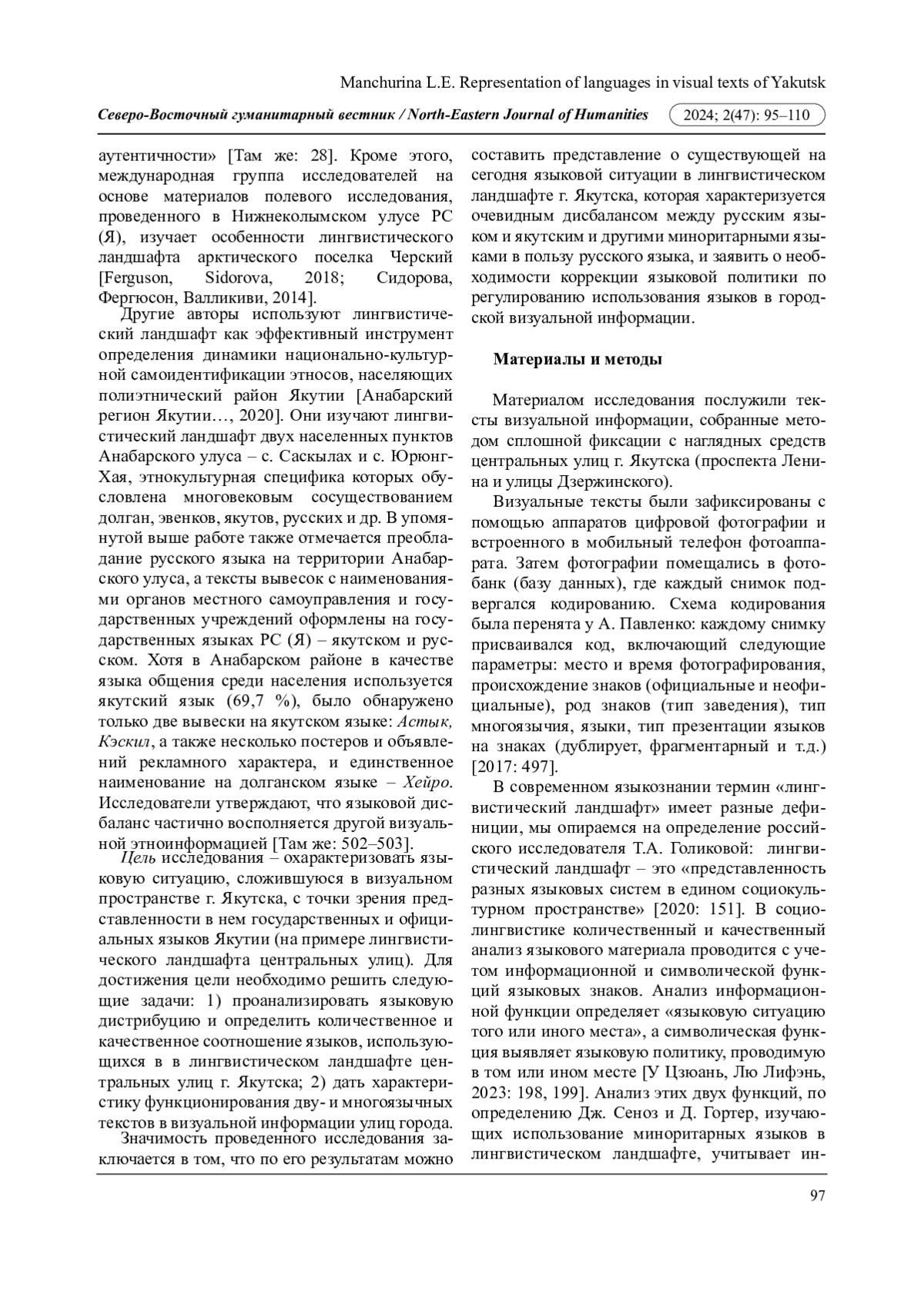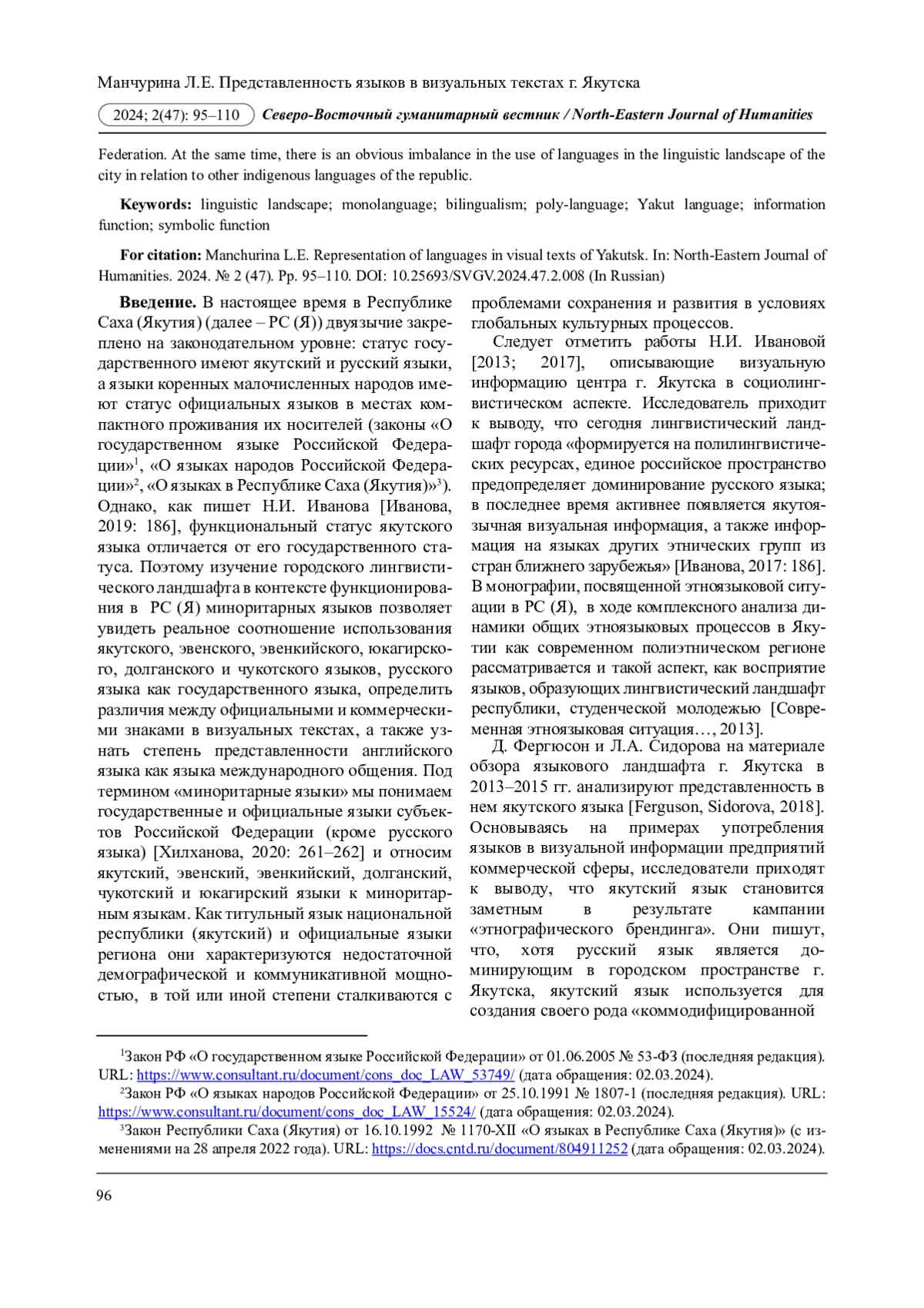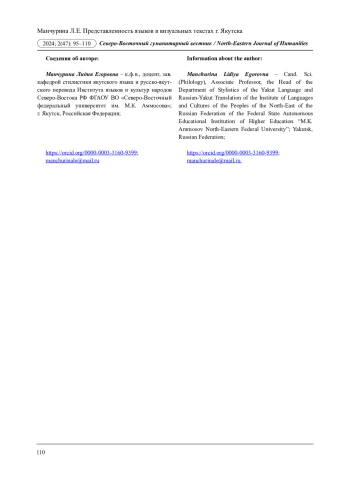 7. Иванова Н.И. Дистрибуция языков в лингвистическом ландшафте г. Якутска: социолингвистический аспект // Северо-Восточный гуманитарный вестник. 2017. № 4 (21). С. 71-76. EDN: YMFONY