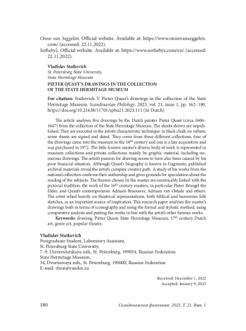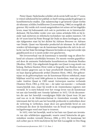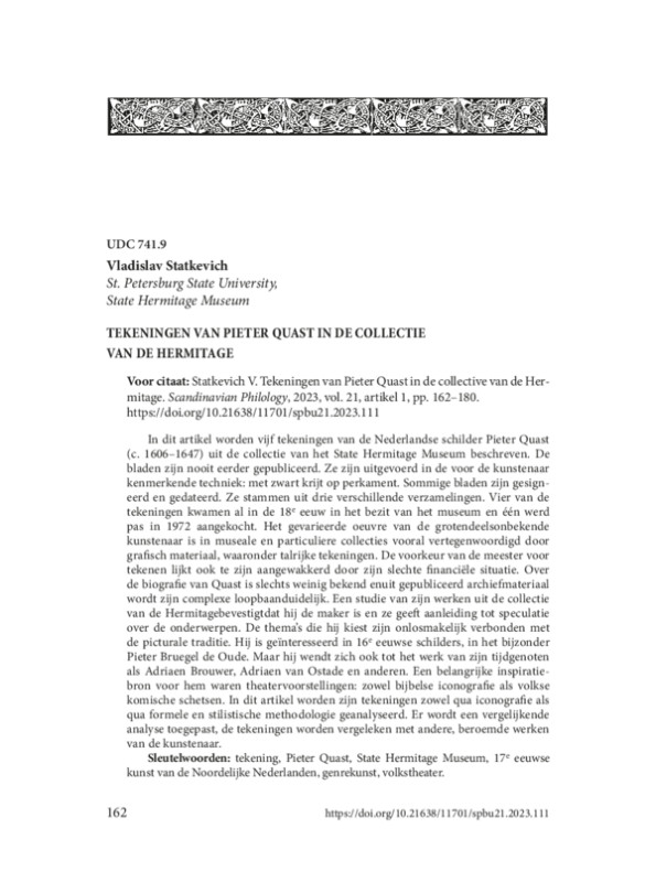 In dit artikel worden vijf tekeningen van de Nederlandse schilder Pieter Quast (c. 1606–1647) uit de collectie van het State Hermitage Museum beschreven. De bladen zijn nooit eerder gepubliceerd. Ze zijn uitgevoerd in de voor de kunstenaar kenmerkende techniek: met zwart krijt op perkament. Sommige bladen zijn gesigneerd en gedateerd. Ze stammen uit drie verschillende verzamelingen. Vier van de tekeningen kwamen al in de 18 e eeuw in het bezit van het museum en één werd pas in 1972 aangekocht. Het gevarieerde oeuvre van de grotendeelsonbekende kunstenaar is in museale en particuliere collecties vooral vertegenwoordigd door grafisch materiaal, waaronder talrijke tekeningen. De voorkeur van de meester voor tekenen lijkt ook te zijn aangewakkerd door zijn slechte financiële situatie. Over de biografie van Quast is slechts weinig bekend enuit gepubliceerd archiefmateriaal wordt zijn complexe loopbaanduidelijk. Een studie van zijn werken uit de collectie van de Hermitagebevestigtdat hij de maker is en ze geeft aanleiding tot speculatie over de onderwerpen. De thema’s die hij kiest zijn onlosmakelijk verbonden met de picturale traditie. Hij is geïnteresseerd in 16 e eeuwse schilders, in het bijzonder Pieter Bruegel de Oude. Maar hij wendt zich ook tot het werk van zijn tijdgenoten als Adriaen Brouwer, Adriaen van Ostade en anderen. Een belangrijke inspiratiebron voor hem waren theatervoorstellingen: zowel bijbelse iconografie als volkse komische schetsen. In dit artikel worden zijn tekeningen zowel qua iconografie als qua formele en stilistische methodologie geanalyseerd. Er wordt een vergelijkende analyse toegepast, de tekeningen worden vergeleken met andere, beroemde werken van de kunstenaar