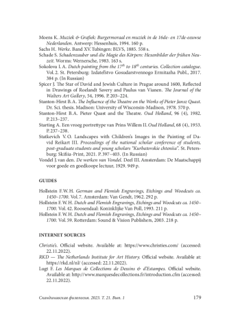 14. Sokolova I. A. Dutch painting from the 17th to 18th centuries. Collection catalogue. Vol. 2. St. Petersburg: Izdatel’stvo Gosudarstvennogo Ermitazha Publ., 2017. 384 p. (In Russian).