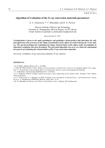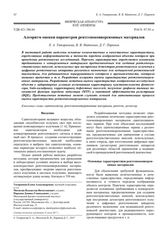 Татаринова Е. А., Матюхин В. В., Паринов Д. Г. Алгоритм оценки параметров рентгеноконверсионных материалов 92