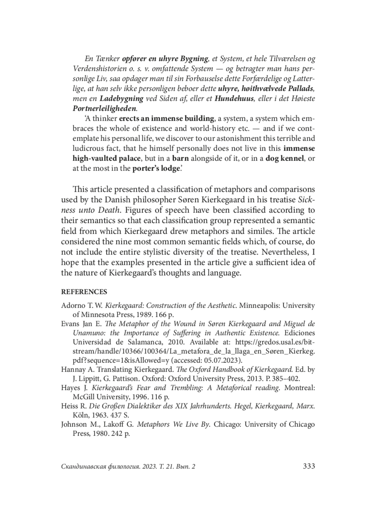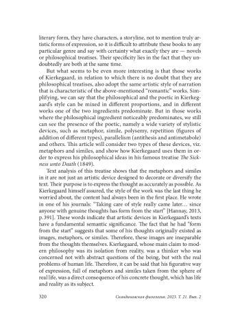 This article presents a classification of those artistic devices that the Danish philosopher Søren Kierkegaard uses in his work The Sickness unto Death. We will talk about such figures of speech as metaphor and simile. This classification arose as a result of the translation and analysis of the treatise since its careful study showed that these stylistic devices are not single and random means of expression designed to decorate or diversify the text, but an integral part of Kierkegaard’s philosophical thinking, which is characterized by figurativeness and concreteness. Kierkegaard blames modern philosophers for abstract thinking divorced from reality, and to present his ideas he chooses a figurative language replete with concrete comparisons since he sees it as his task to consider the real problems of human life. This classification is based on the division of artistic devices not according to their type, but according to their semantics. Each group of devices is a “semantic field” from which Kierkegaard drew metaphors and comparisons for a more precise and at the same time more figurative description of his views. The article considers the nine most common semantic fields, while in The Sickness unto Death, there are more than twenty of them. Since metaphors and comparisons are an integral part of Kierkegaard’s text, a careful study of them is very important both for philosophers who want to penetrate deeper into the concept of the Danish thinker, and for translators who seek to convey the author’s original text as accurately as possible. Thus, the main task of the presented classification is to approach the understanding of the concept of “despair” through those figurative characteristics that Kierkegaard endows them with