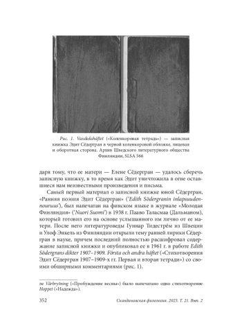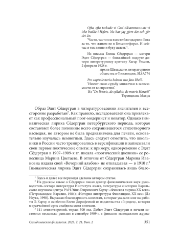 Образ Эдит Сёдергран в литературоведении значителен и всесторонне разработан 2. Как правило, исследователей она привлекает как профессиональный поэт-модернист и новатор. Однако гимназическая лирика Сёдергран петербургского периода, которая составляет более половины всего сохранившегося стихотворного наследия, но автором не была предназначена для печати, основательно изучалась немногими. Здесь следует отметить, что школьники в России часто тренировались в версификации и записывали свои первые поэтические опыты: к примеру, одновременно с Эдит Сёдергран в 1907–1909-х гг. писала «поэтический дневник» ее ровесница Марина Цветаева.