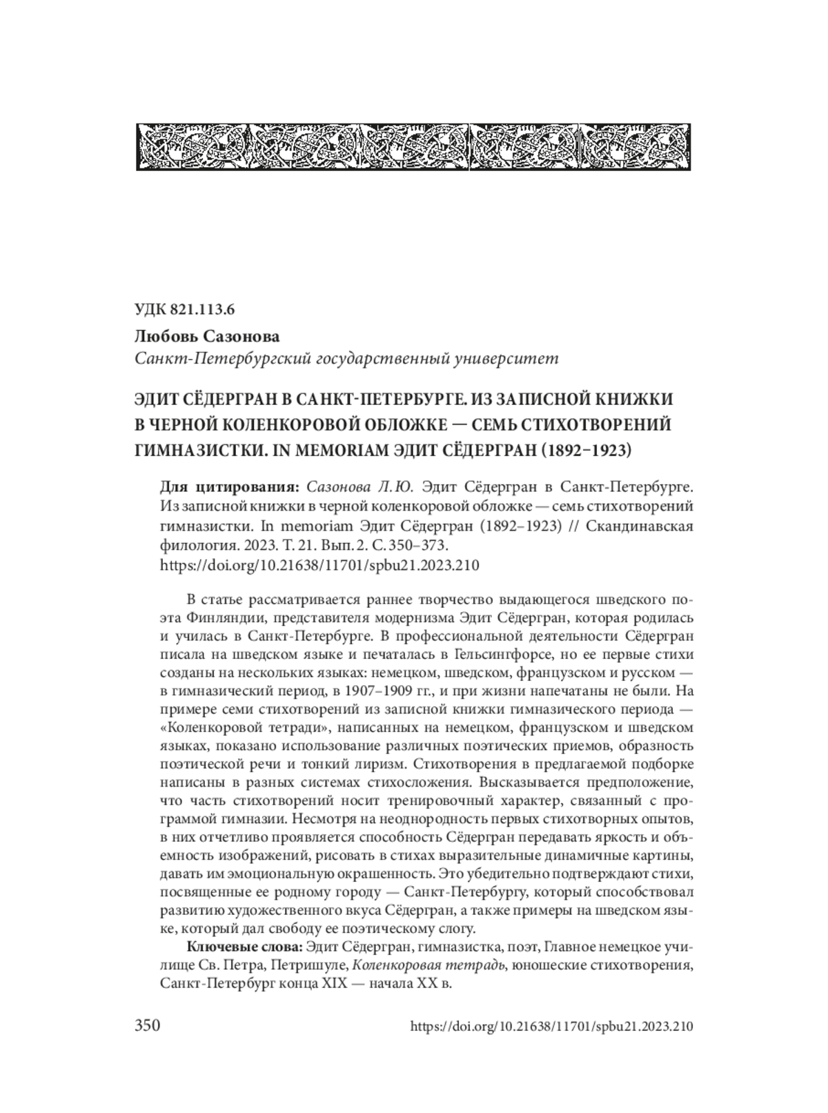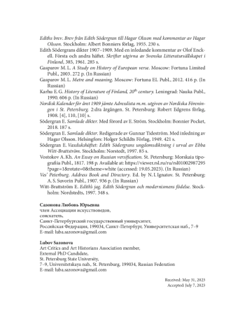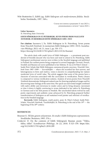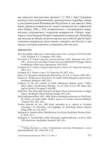7. Crnković D. On the contexts of Edith Sӧdergran’s Russian poem “Tikho, tikho, tikho”. Scandinavian Philology, 16 (2), 2018. P. 323-339. DOI: 10.21638/11701/spbu21.2018.209 EDN: YTGPAL