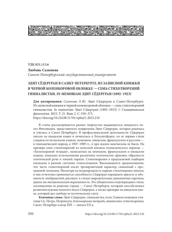 В статье рассматривается раннее творчество выдающегося шведского поэта Финляндии, представителя модернизма Эдит Сёдергран, которая родилась и училась в Санкт-Петербурге. В профессиональной деятельности Сёдергран писала на шведском языке и печаталась в Гельсингфорсе, но ее первые стихи созданы на нескольких языках: немецком, шведском, французском и русском — в гимназический период, в 1907–1909 гг., и при жизни напечатаны не были. На примере семи стихотворений из записной книжки гимназического периода — «Коленкоровой тетради», написанных на немецком, французском и шведском языках, показано использование различных поэтических приемов, образность поэтической речи и тонкий лиризм. Стихотворения в предлагаемой подборке написаны в разных системах стихосложения. Высказывается предположение, что часть стихотворений носит тренировочный характер, связанный с программой гимназии. Несмотря на неоднородность первых стихотворных опытов, в них отчетливо проявляется способность Сёдергран передавать яркость и объемность изображений, рисовать в стихах выразительные динамичные картины, давать им эмоциональную окрашенность. Это убедительно подтверждают стихи, посвященные ее родному городу — Санкт-Петербургу, который способствовал развитию художественного вкуса Сёдергран, а также примеры на шведском языке, который дал свободу ее поэтическому слогу