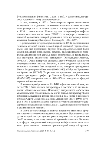 Осенью 1935 г. первые студенты пришли на занятия по шведскому языку во «дворец Петра II» на Васильевском острове, прямо напротив Медного всадника, и в тот момент вряд ли кто-нибудь осознавал историческую важность этого события. А между тем это означало создание первого в стране специального отделения, дающего высшее университетское образование в области скандинавистики