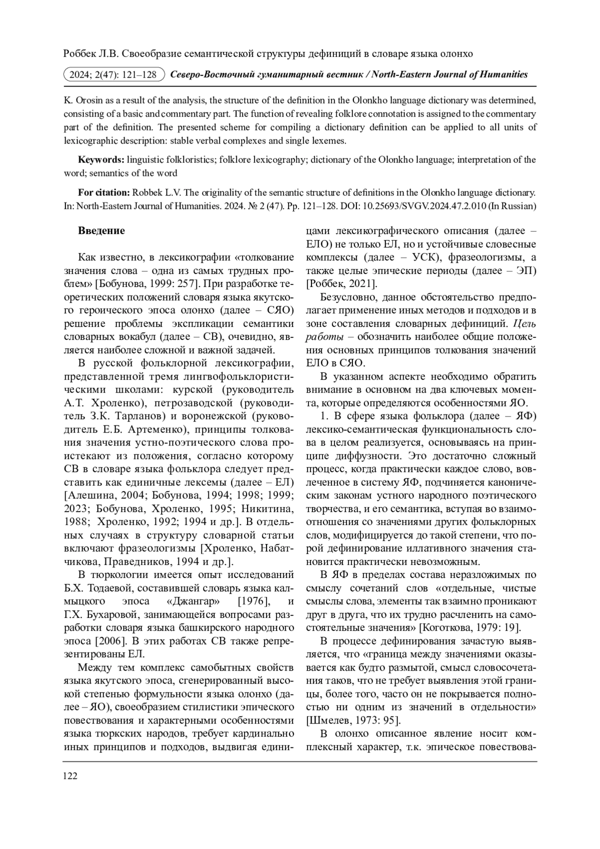 20. Роббек Л.В. Единицы лексикографического описания в словаре языка олонхо // Вестник Северо-Восточного федерального университета им. М.К. Аммосова. Серия: Эпосоведение. 2021. № 2 (22). С. 69-78. DOI: 10.25587/a8299-5392-7163-q EDN: ATQQKI