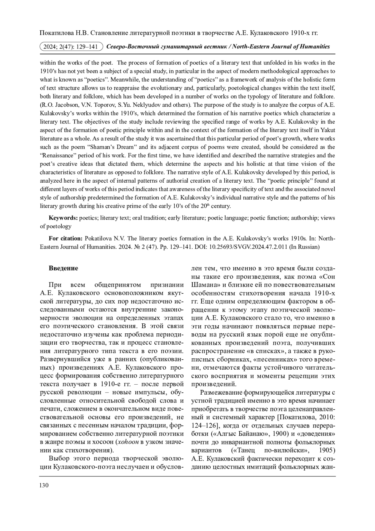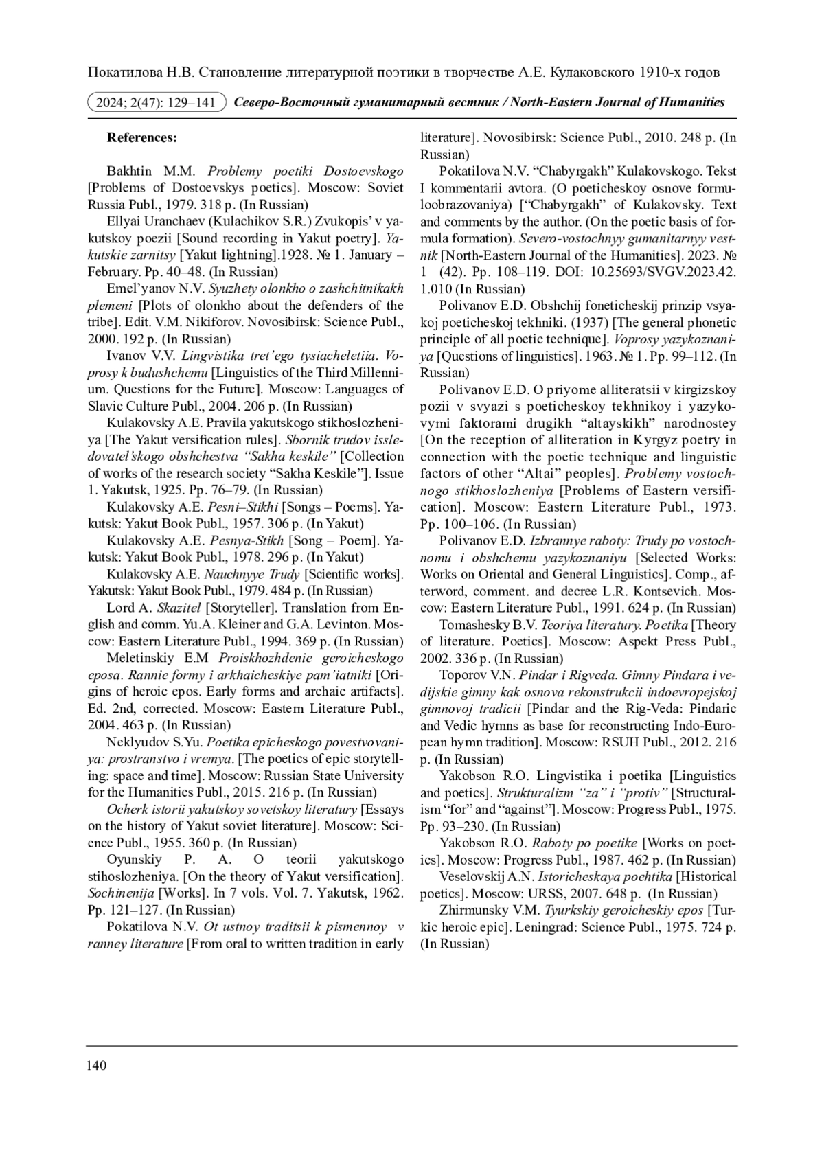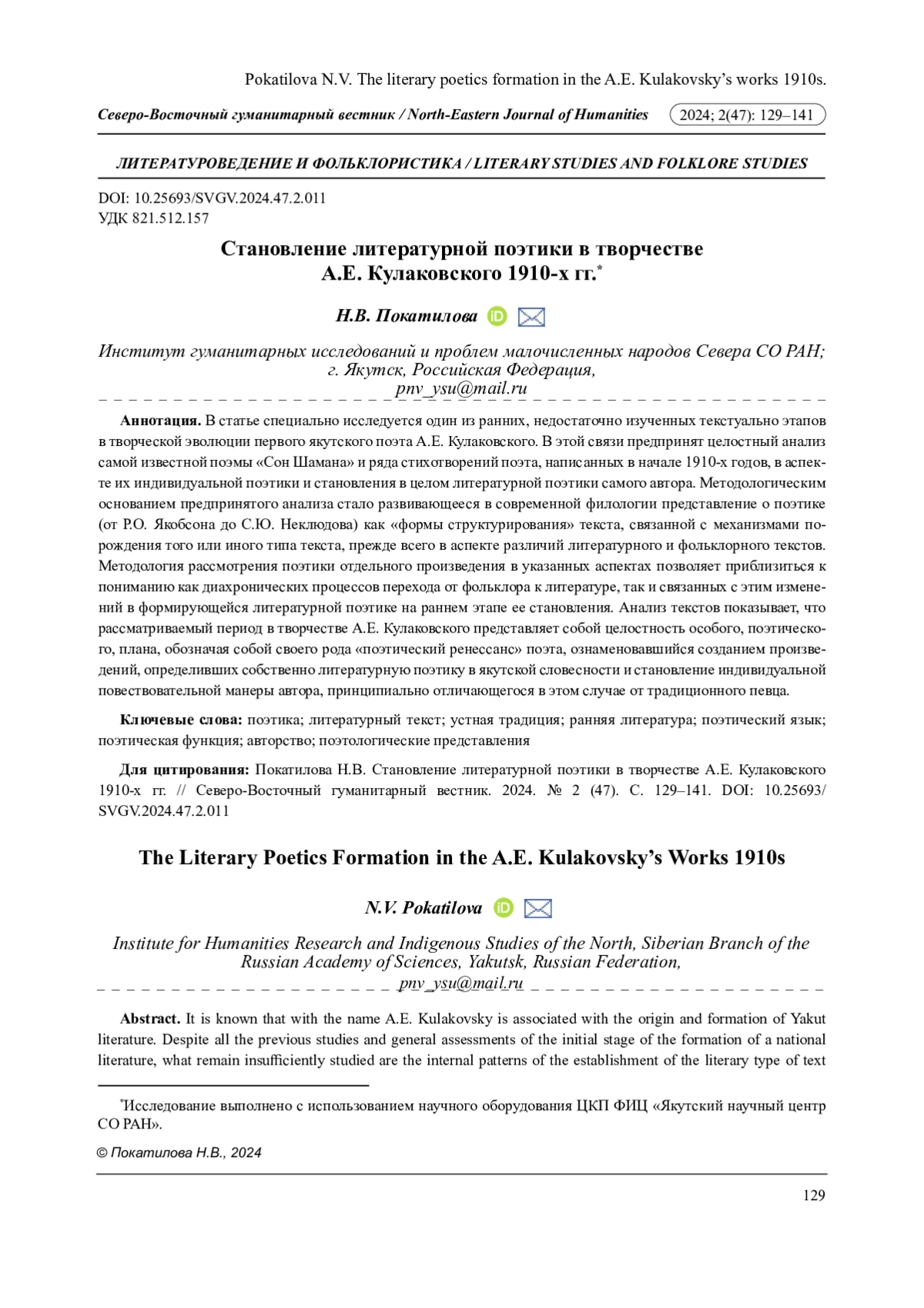 14. Покатилова Н.В. “Чабыргах” А.Е. Кулаковского. Текст и комментарии автора (О поэтической основе формулообразования) // Северо-Восточный гуманитарный вестник. 2023. № 1 (42). С. 108-119. DOI: 10.25693/SVGV.2023.42.1.010 EDN: DHXFDX