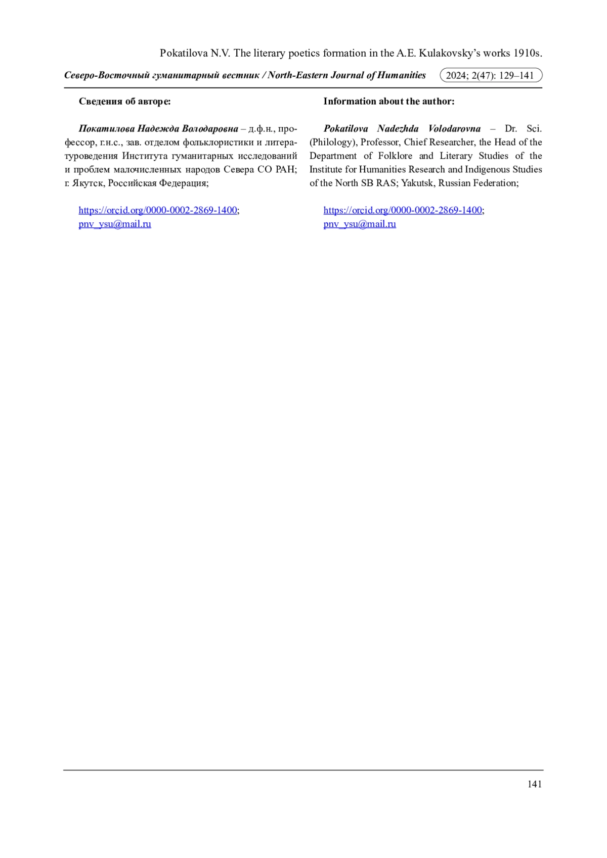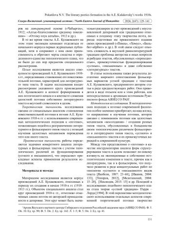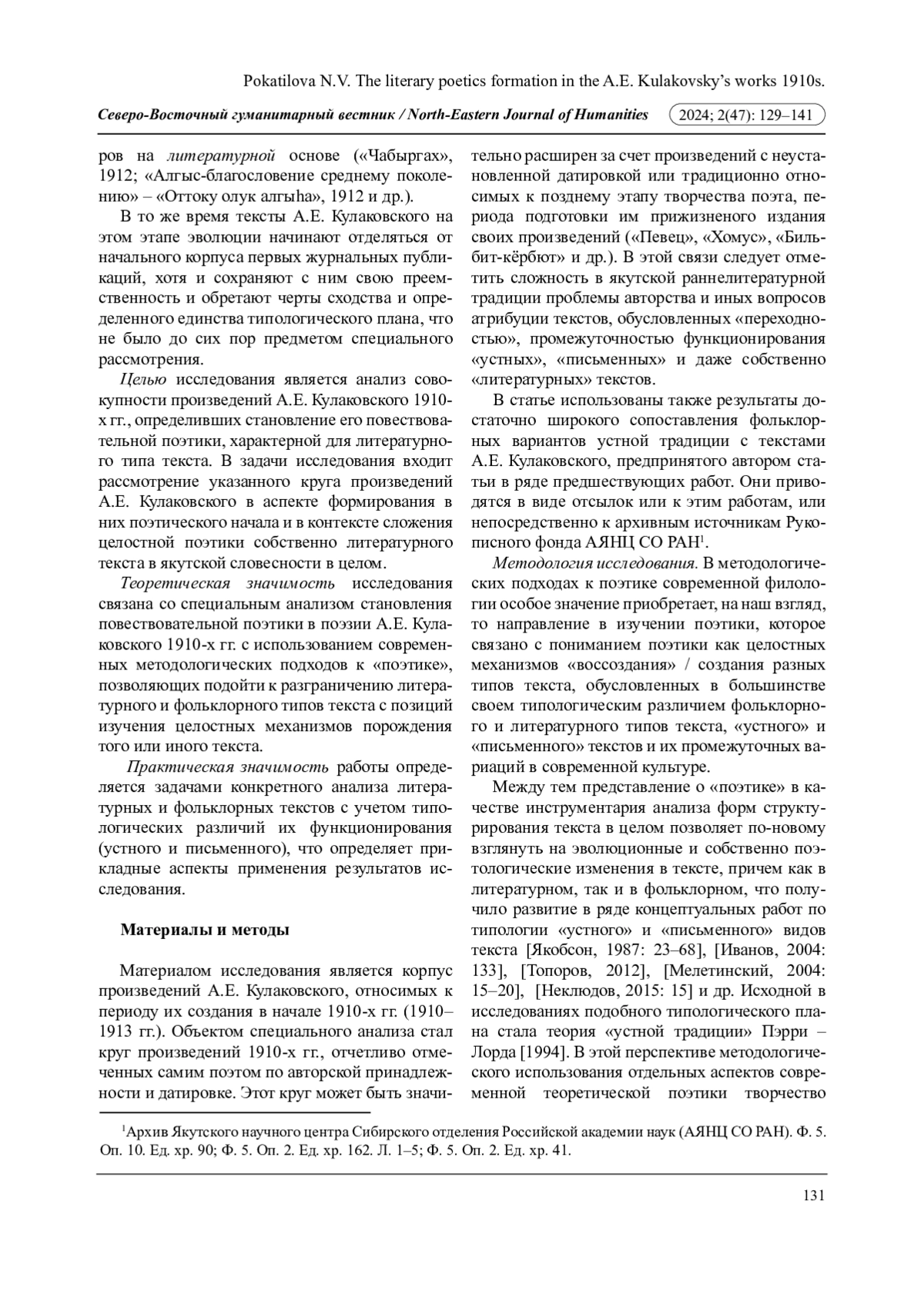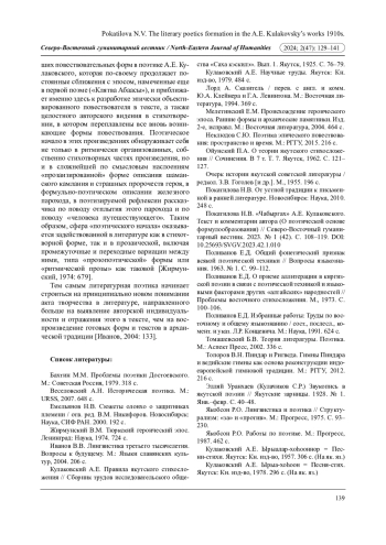 14. Покатилова Н.В. “Чабыргах” А.Е. Кулаковского. Текст и комментарии автора (О поэтической основе формулообразования) // Северо-Восточный гуманитарный вестник. 2023. № 1 (42). С. 108-119. DOI: 10.25693/SVGV.2023.42.1.010 EDN: DHXFDX