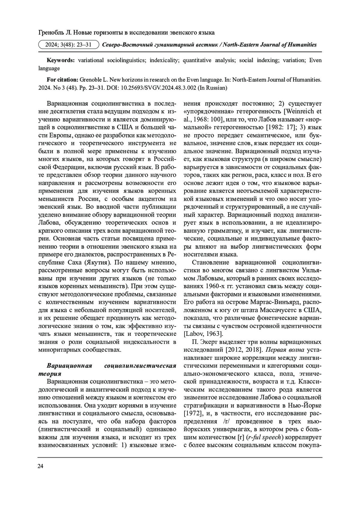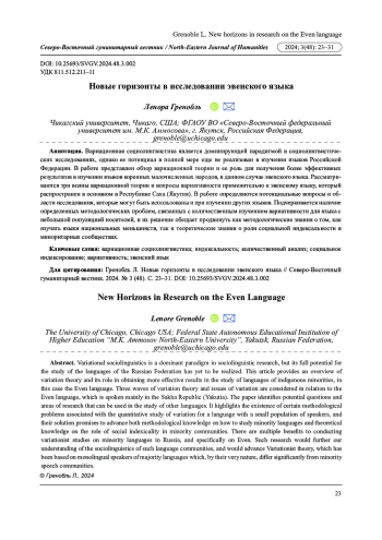 Вариационная социолингвистика является доминирующей парадигмой в социолингвистических исследованиях, однако ее потенциал в полной мере еще не реализован в изучении языков Российской Федерации. В работе представлен обзор вариационной теории и ее роль для получения более эффективных результатов в изучении языков коренных малочисленных народов, в данном случае эвенского языка. Рассматриваются три волны вариационной теории и вопросы вариативности применительно к эвенскому языку, который распространен в основном в Республике Саха (Якутия). В работе определяются потенциальные вопросы и области исследования, которые могут быть использованы и при изучении других языков. Подчеркивается наличие определенных методологических проблем, связанных с количественным изучением вариативности для языка с небольшой популяцией носителей, и их решение обещает продвинуть как методологические знания о том, как изучать языки национальных меньшинств, так и теоретические знания о роли социальной индексальности в миноритарных сообществах.
