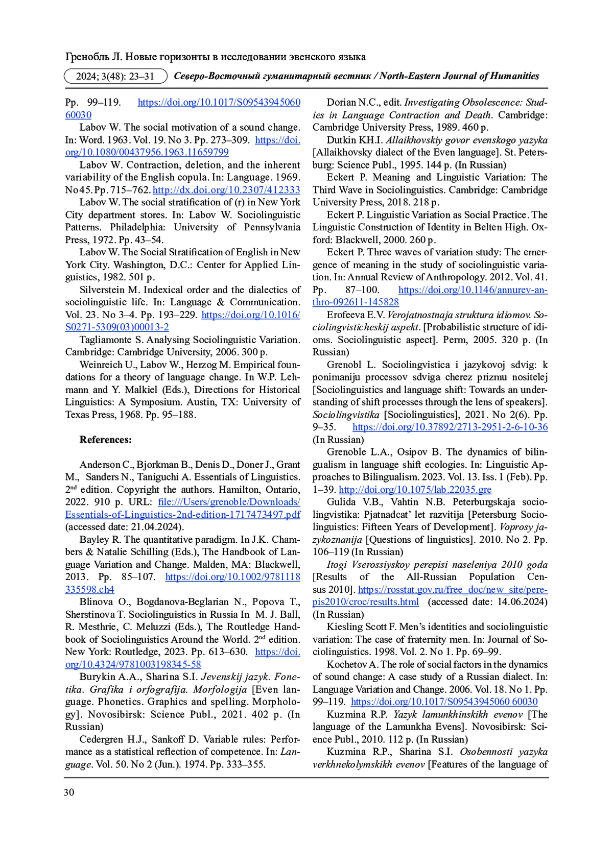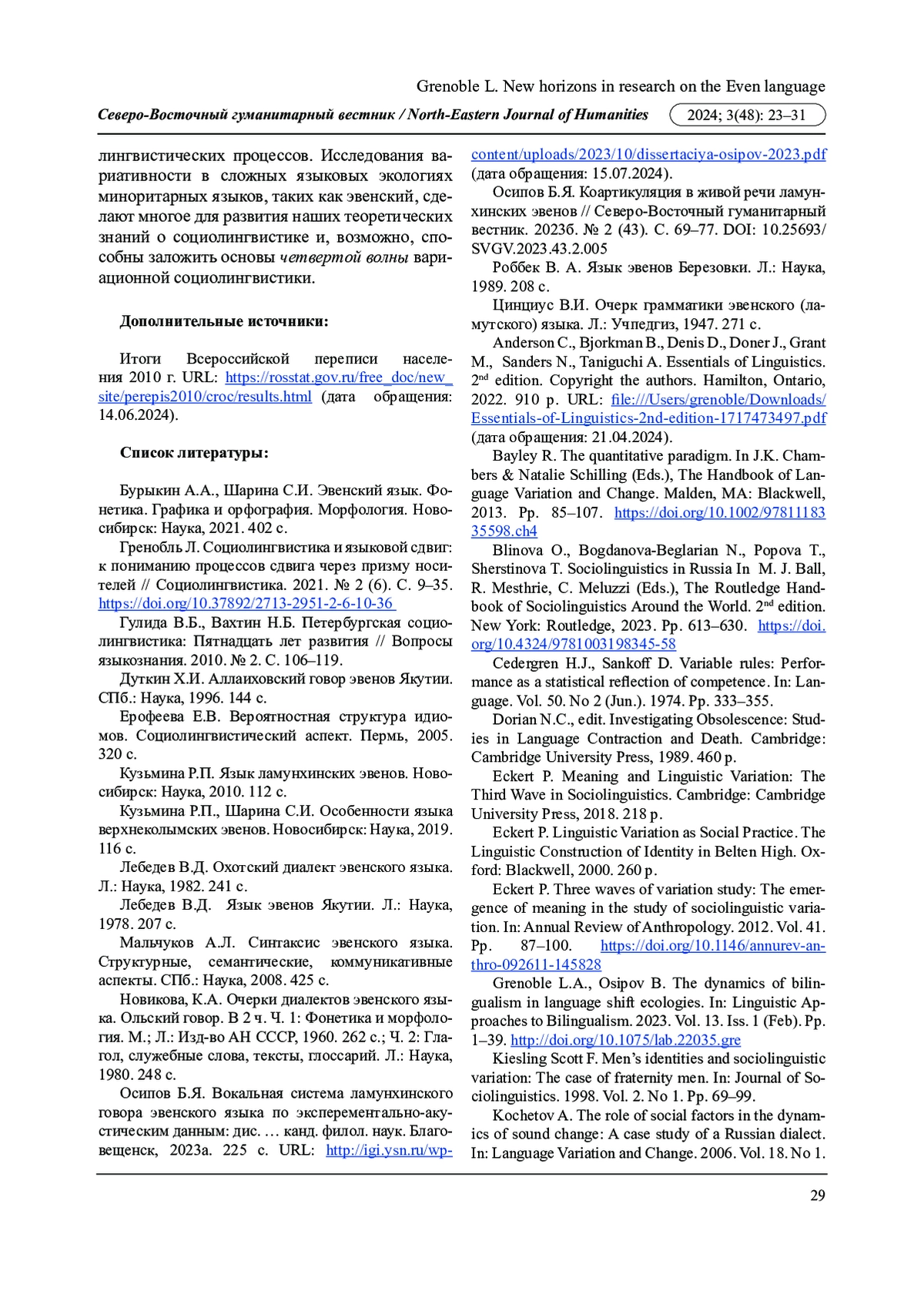 3. Гренобль Л. Социолингвистика и языковой сдвиг: к пониманию процессов сдвига через призму носителей // Социолингвистика. 2021. № 2 (6). С. 9-35. DOI: 10.37892/2713-2951-2-6-10-36 EDN: KKTVBX