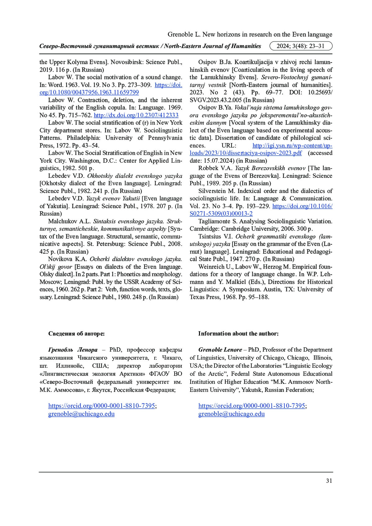 14. Осипов Б.Я. Коартикуляция в живой речи ламунхинских эвенов // Северо-Восточный гуманитарный вестник. 2023б. № 2 (43). С. 69-77. DOI: 10.25693/SVGV.2023.43.2.005 EDN: KTMLCG