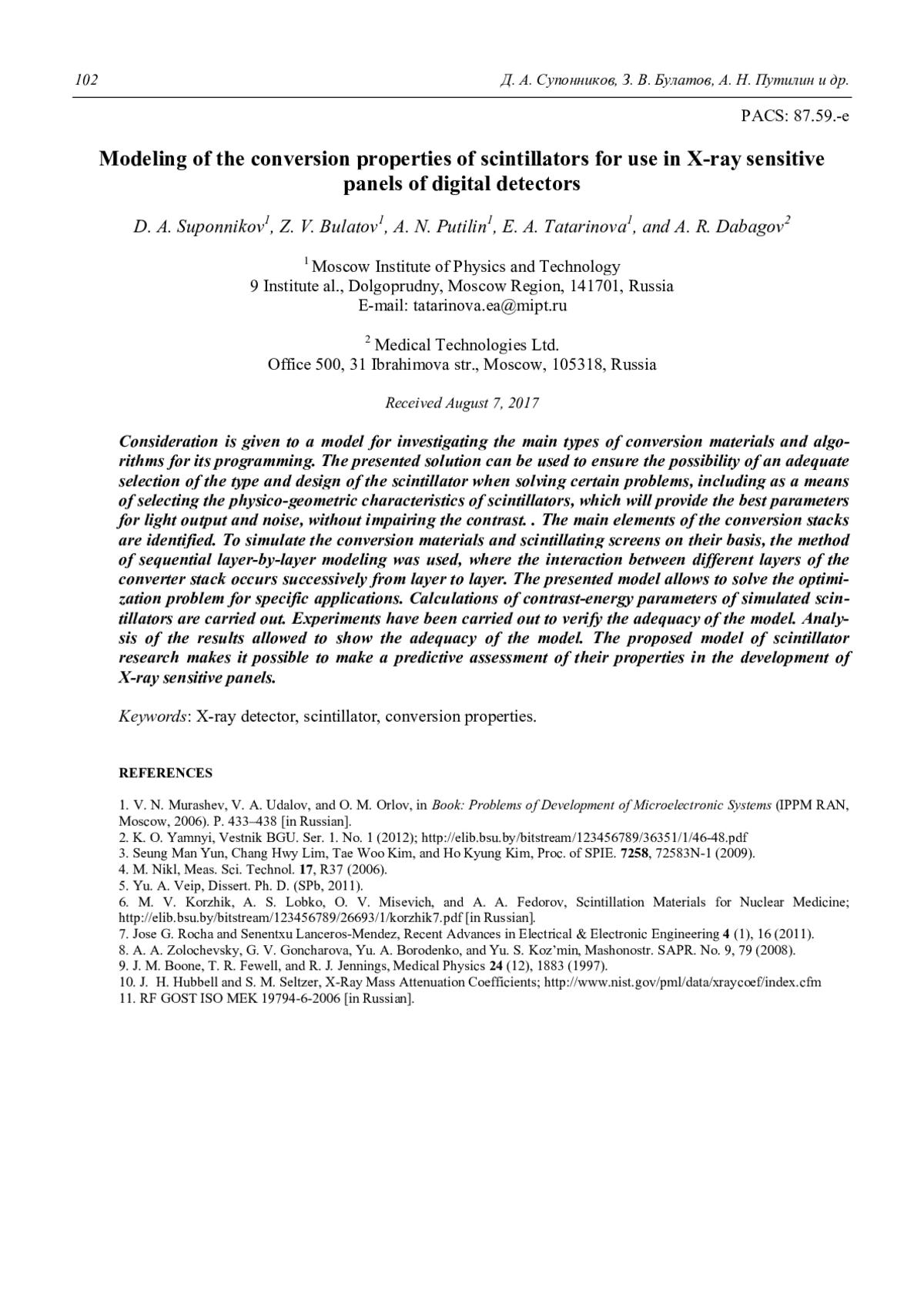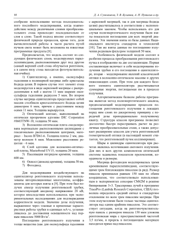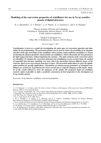 D. A. Suponnikov, Z. V. Bulatov, A. N. Putilin, E. A. Tatarinova, and A. R. Dabagov Modeling of the conversion properties of scintillators for use in X-ray sensitive panels of digital detectors 97