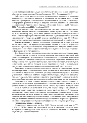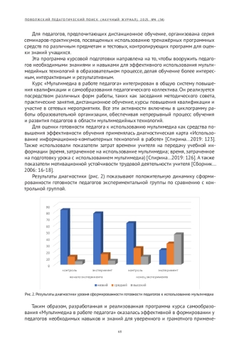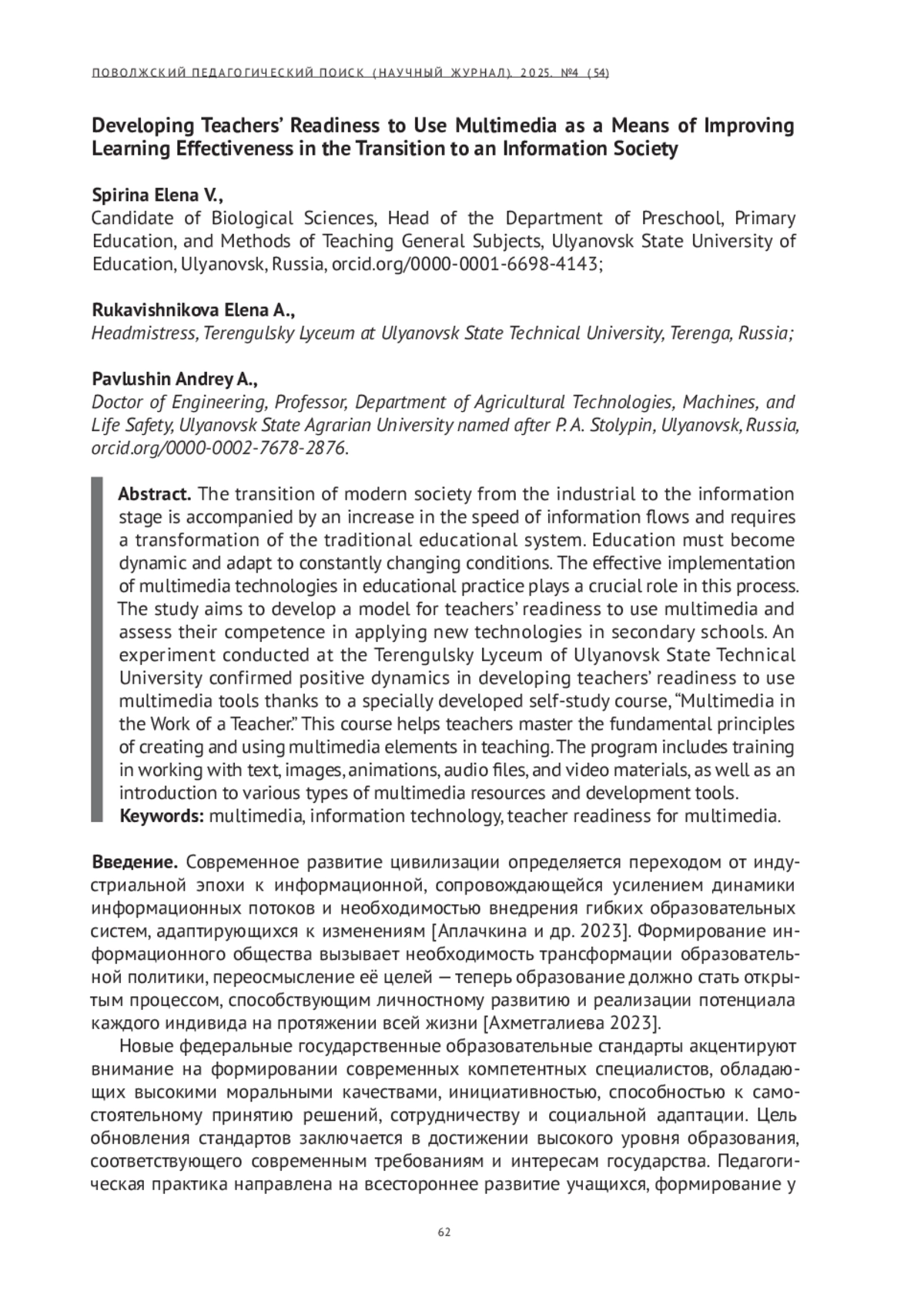 Переход современного общества от индустриального этапа к информационному сопровождается увеличением скорости информационных потоков и требует преобразования традиционной образовательной системы. Образование должно стать динамичным и адаптироваться к постоянно меняющимся условиям. Важнейшую роль в данном процессе играет эффективное внедрение мультимедийных технологий в образовательную практику. Исследование направлено на разработку модели готовности педагогов к использованию мультимедиа и оценку их компетенции в применении новых технологий в средних школах. Проведение эксперимента в МОУ «Тереньгульский лицей при УлГТУ» подтвердило позитивную динамику формирования готовности педагогов к применению мультимедийных средств благодаря специально разработанному курсу самообразования «Мультимедиа в работе педагога». Данный курс помогает учителям освоить основные принципы создания и использования мультимедийных элементов в обучении. Программа включает обучение работе с текстом, изображениями, анимациями, звуковыми файлами и видеоматериалами, а также знакомство с различными типами мультимедийных ресурсов и инструментами для их разработки.