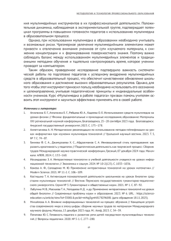 8. Михайлова А. А. Влияние информационных технологий на процесс обучения // Концепция устройства современного мира в эпоху цифры: сборник научных трудов по материалам Международного научного форума, Москва, 15 декабря 2023 года. М.: Алеф, 2023. С. 54-59.