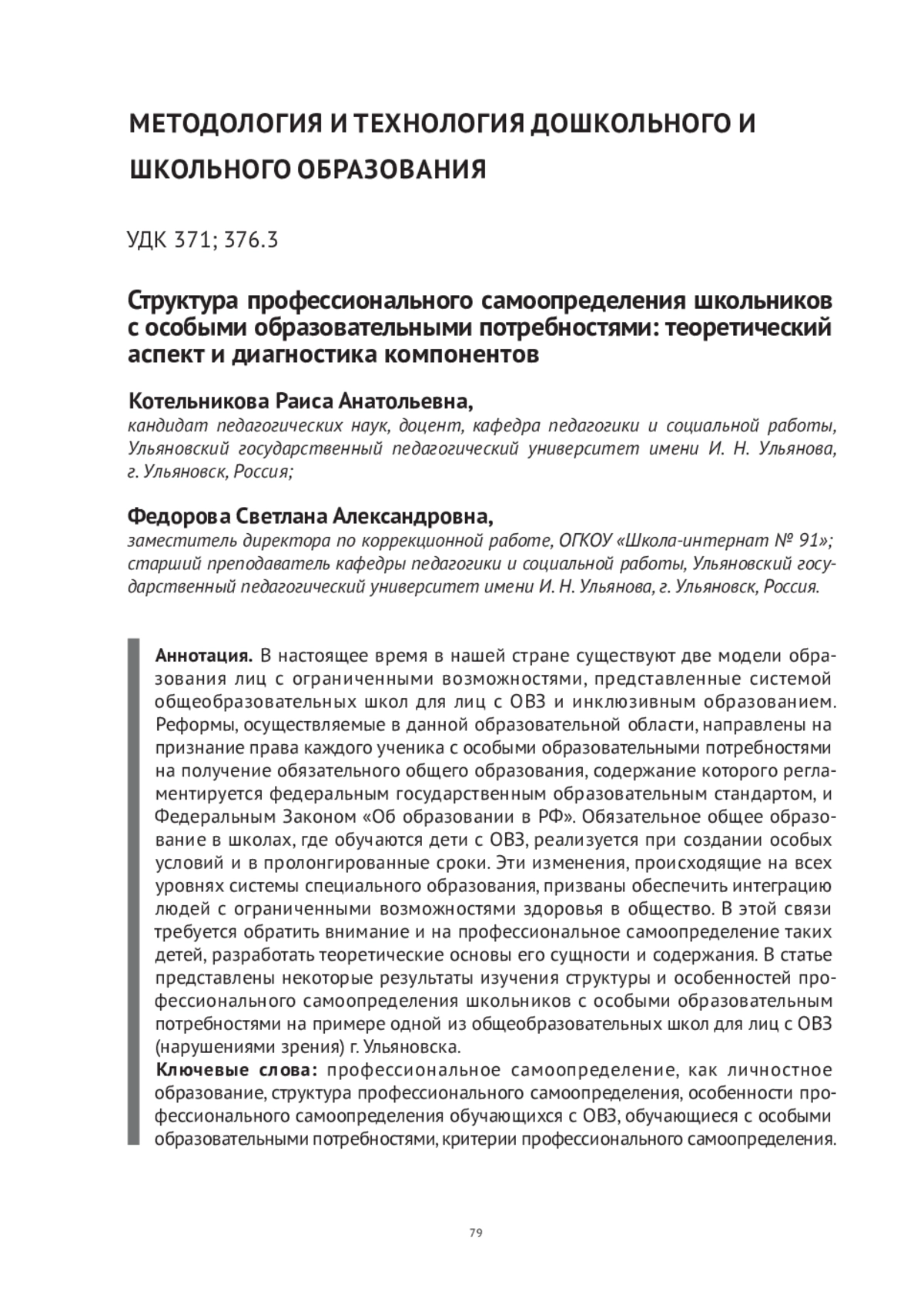 В настоящее время в нашей стране существуют две модели образования лиц с ограниченными возможностями, представленные системой общеобразовательных школ для лиц с ОВЗ и инклюзивным образованием. Реформы, осуществляемые в данной образовательной области, направлены на признание права каждого ученика с особыми образовательными потребностями на получение обязательного общего образования, содержание которого регламентируется федеральным государственным образовательным стандартом, и Федеральным Законом «Об образовании в РФ». Обязательное общее образование в школах, где обучаются дети с ОВЗ, реализуется при создании особых условий и в пролонгированные сроки. Эти изменения, происходящие на всех уровнях системы специального образования, призваны обеспечить интеграцию людей с ограниченными возможностями здоровья в общество. В этой связи требуется обратить внимание и на профессиональное самоопределение таких детей, разработать теоретические основы его сущности и содержания. В статье представлены некоторые результаты изучения структуры и особенностей профессионального самоопределения школьников с особыми образовательным потребностями на примере одной из общеобразовательных школ для лиц с ОВЗ (нарушениями зрения) г. Ульяновска.