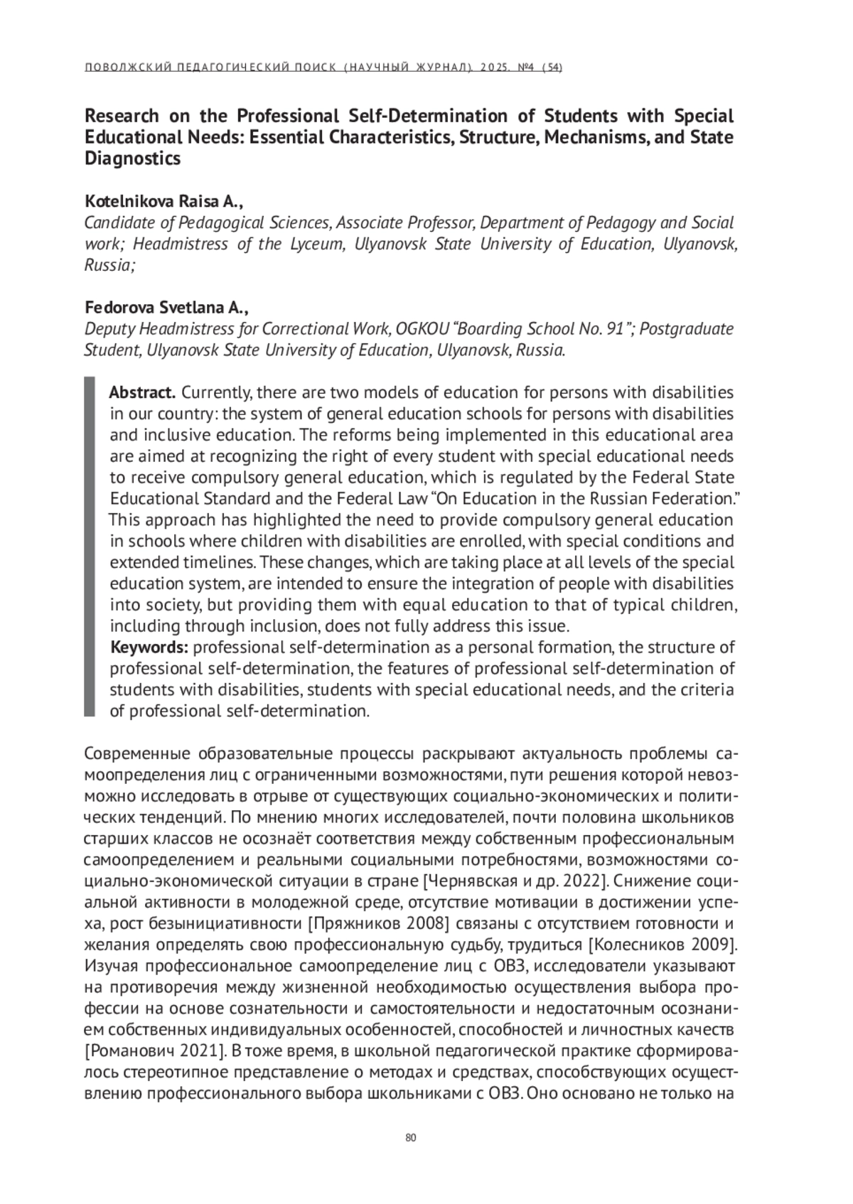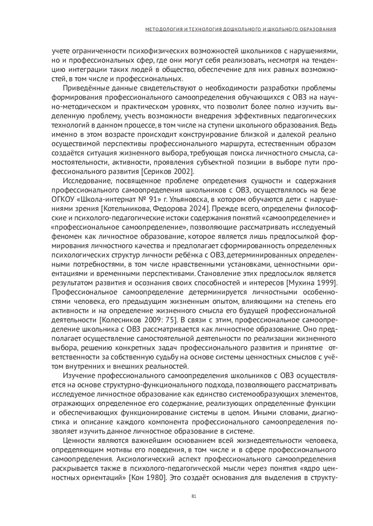5. Котельникова Р. А., Федорова С. А. Формирование профессионального самоопределения обучающихся школы-интерната // Поволжский педагогический поиск. 2024. № 1 (47). С. 64-72.