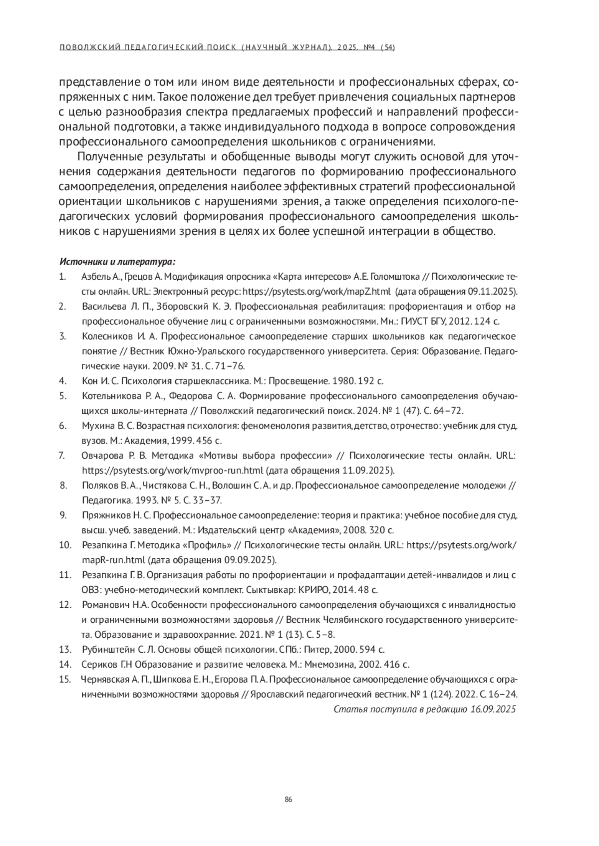 15. Чернявская А. П., Шипкова Е. Н., Егорова П. А. Профессиональное самоопределение обучающихся с ограниченными возможностями здоровья // Ярославский педагогический вестник. № 1 (124). 2022. С. 16-24.