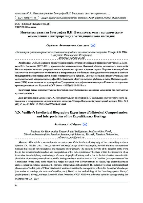 Статья посвящена реконструкции интеллектуальной биографии выдающегося ученого-североведа В. Н. Васильева (1877-1931), уроженца Амгинского селения Якутской области, оставившего после себя богатое научное наследие, рассредоточенное в различных архивах и музеях страны. Научная новизна работы заключается в историческом осмыслении и интерпретации его богатого экспедиционного наследия в аспекте междисциплинарной методологии новой биографической истории. Впервые в рамках проекта увидела свет фундаментальная авторская монография В. Н. Васильева «Тунгусы Алдано-Майского и Аяно-Охотского районов» (2024), написанная им во время работы Тунгусского этнографического подотряда Комиссии по изучению производительных сил Якутской АССР (далее - КЯР) (1926-1928 гг.).