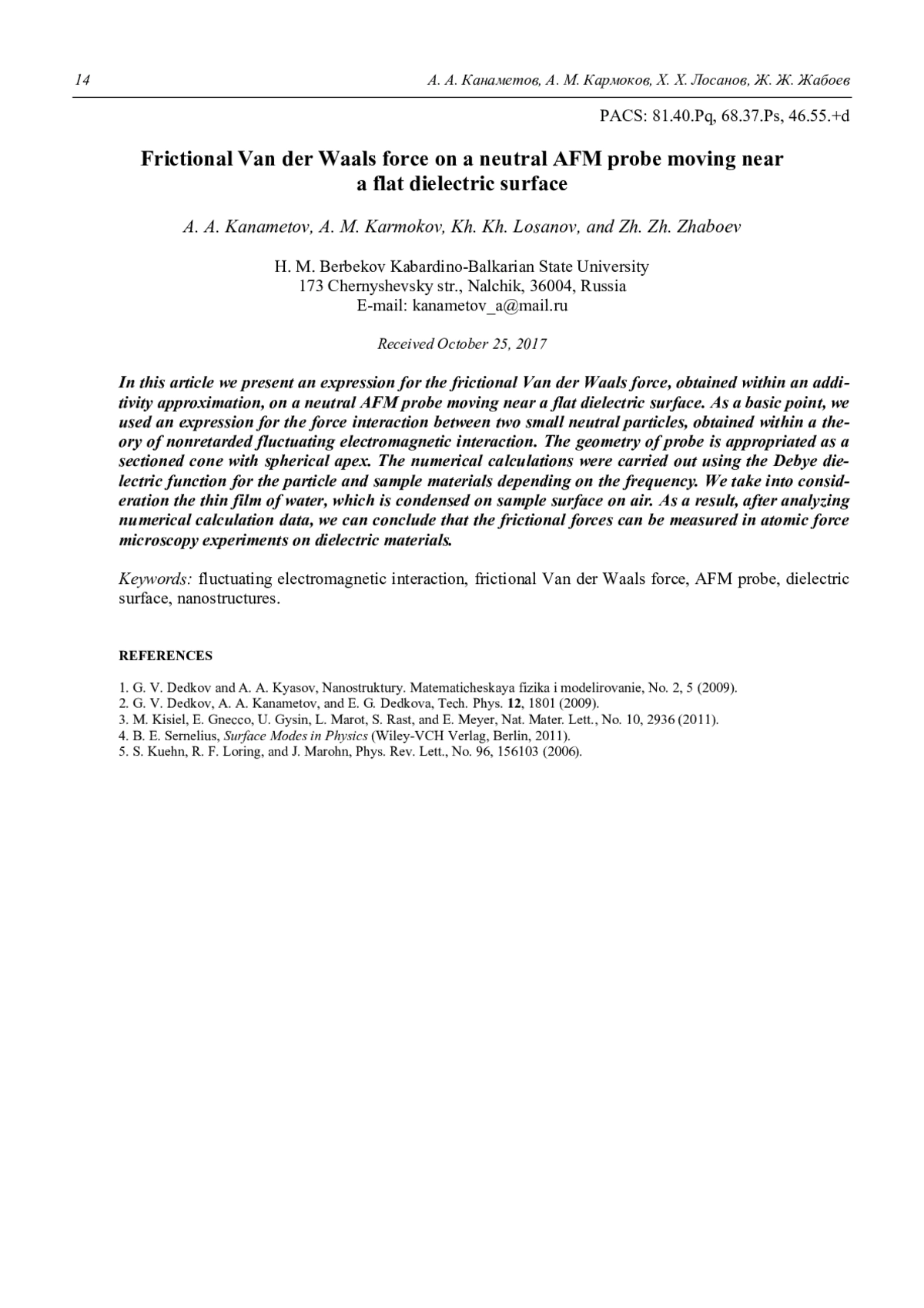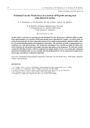 A. A. Kanametov, A. M. Karmokov, Kh. Kh. Losanov, and Zh. Zh. Zhaboev Frictional Van der Waals force on a neutral AFM probe moving near a flat dielectric surface 10
