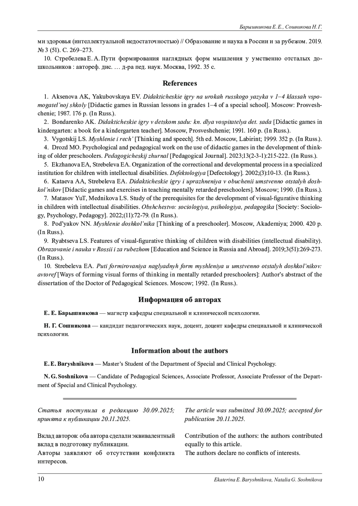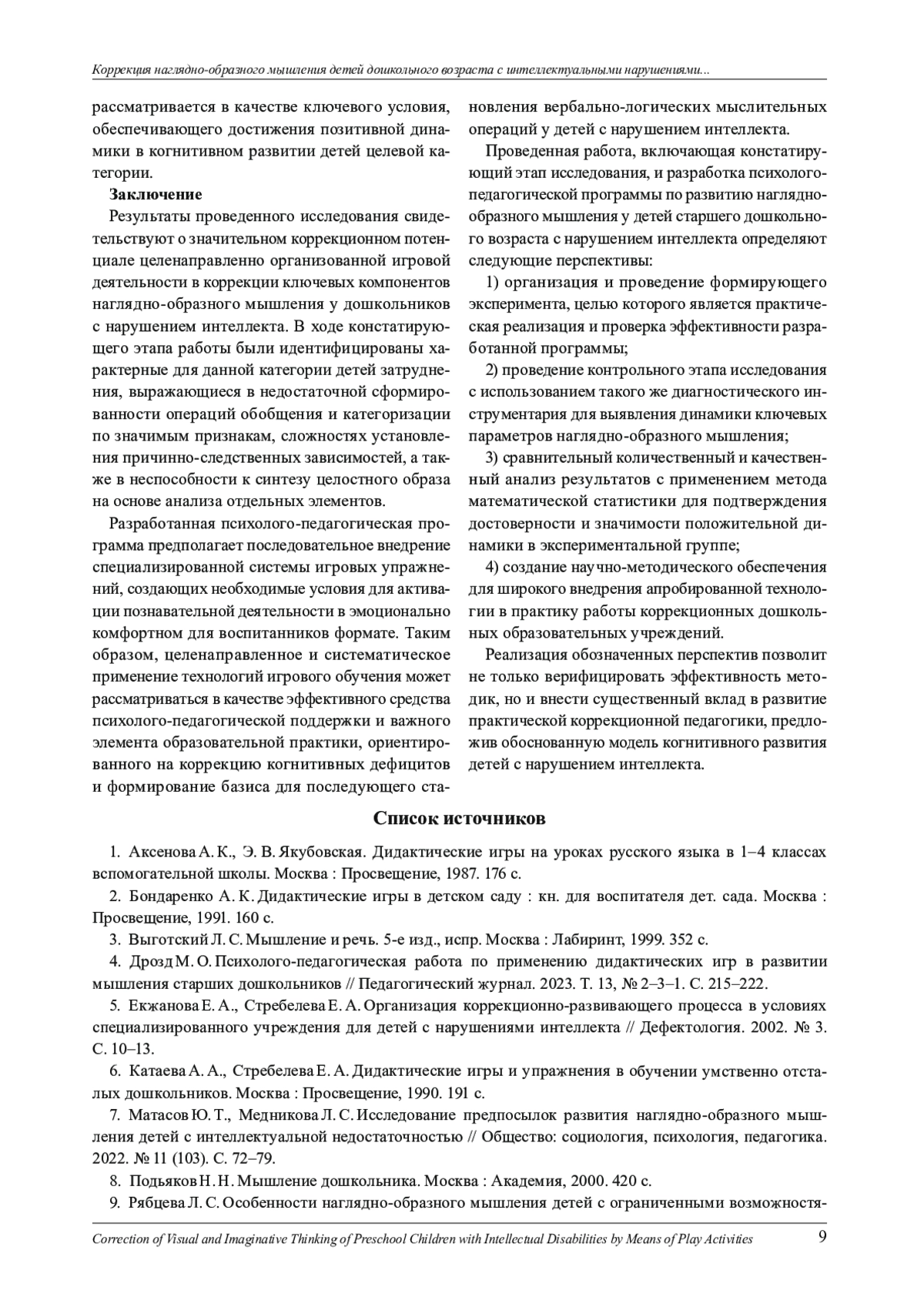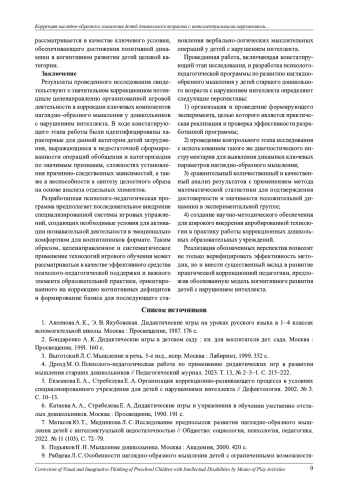 9. Рябцева Л. С. Особенности наглядно-образного мышления детей с ограниченными возможностями здоровья (интеллектуальной недостаточностью) // Образование и наука в России и за рубежом. 2019. №3 (51). С. 269-273.