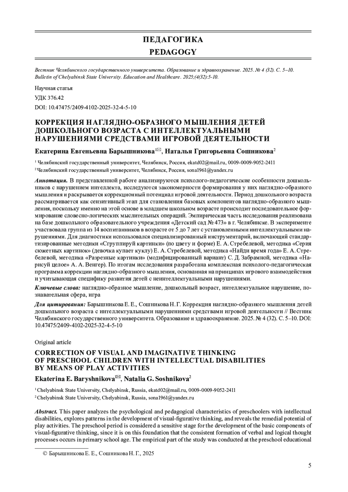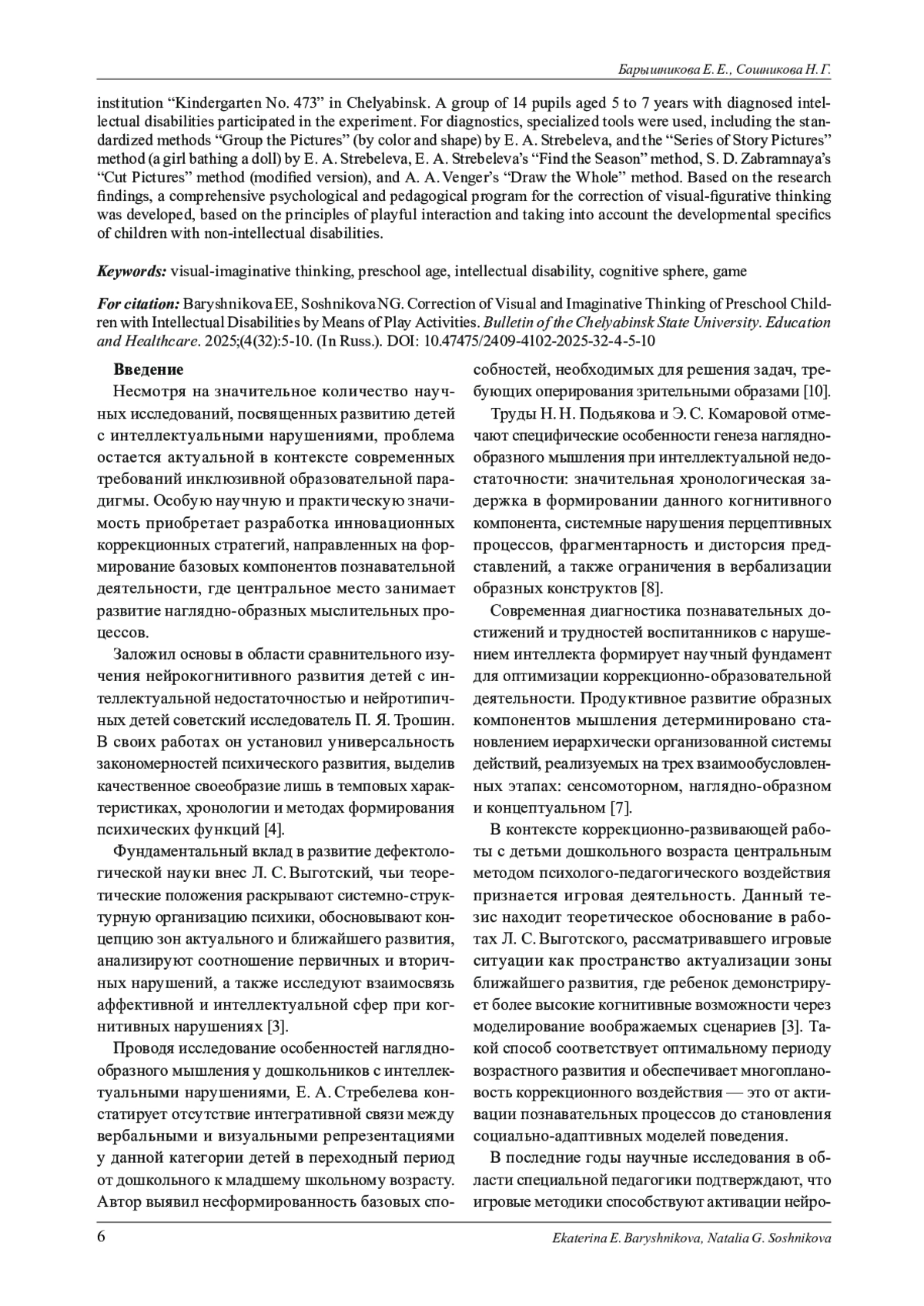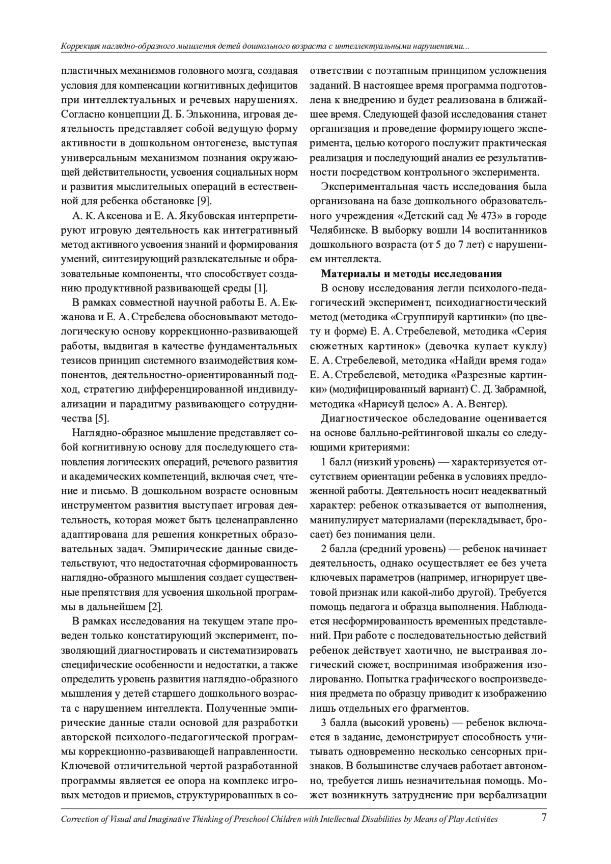 В представленной работе анализируются психолого-педагогические особенности дошкольников с нарушением интеллекта, исследуются закономерности формирования у них наглядно-образного мышления и раскрывается коррекционный потенциал игровой деятельности. Период дошкольного возраста рассматривается как сензитивный этап для становления базовых компонентов наглядно-образного мышления, поскольку именно на этой основе в младшем школьном возрасте происходит последовательное формирование словесно-логических мыслительных операций. Эмпирическая часть исследования реализована на базе дошкольного образовательного учреждения «Детский сад № 473» в г. Челябинске. В эксперименте участвовала группа из 14 воспитанников в возрасте от 5 до 7 лет с установленными интеллектуальными нарушениями. Для диагностики использовался специализированный инструментарий, включающий стандартизированные методики «Сгруппируй картинки» (по цвету и форме) Е. А. Стребелевой, методика «Серия сюжетных картинок» (девочка купает куклу) Е. А. Стребелевой, методика «Найди время года» Е. А. Стребелевой, методика «Разрезные картинки» (модифицированный вариант) С. Д. Забрамной, методика «Нарисуй целое» А. А. Венгер). По итогам исследования разработана комплексная психолого-педагогическая программа коррекции наглядно-образного мышления, основанная на принципах игрового взаимодействия и учитывающая специфику развития детей с неинтеллектуальными нарушениями.