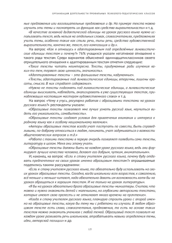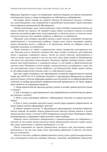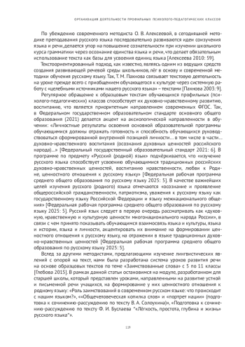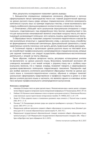 Подчёркивается и объясняется важность регулярного использования образцовых текстов на уроках русского языка в профильных(психолого-педагогических) классах как главного источника формирования духовно-нравственного потенциала обучающихся. Рассматриваются выдержки из образовательных документов, подтверждающих актуальность заявленной темы. Описываются фрагменты уроков развития речи для старшеклассников, обучающихся психолого-педагогических классов, разработанные на основе текстоориентированного подхода. Приводятся фрагменты творческих работ обучающихся как отклик на тексты, которые легли в основу уроков развития речи. Описываются результаты опроса обучающихся 11-х классов по выявлению компетенций, важных для их будущей педагогической деятельности. Делаются выводы об эффективности текстоориентированных уроков в психолого-педагогических классах в аспекте профессионального самоопределения выпускников.