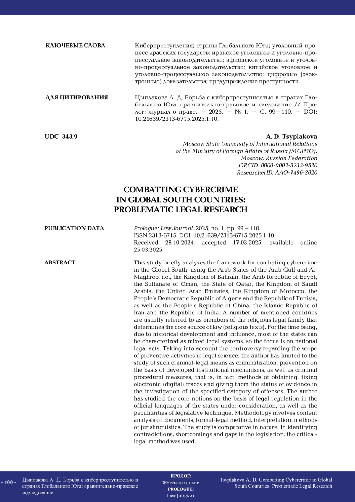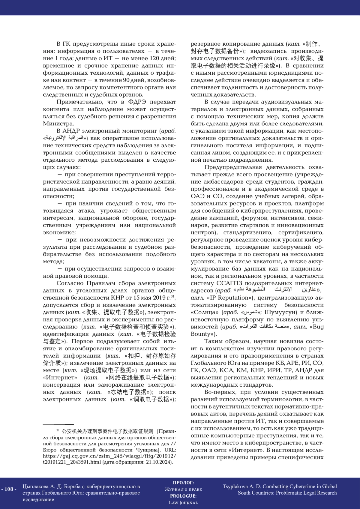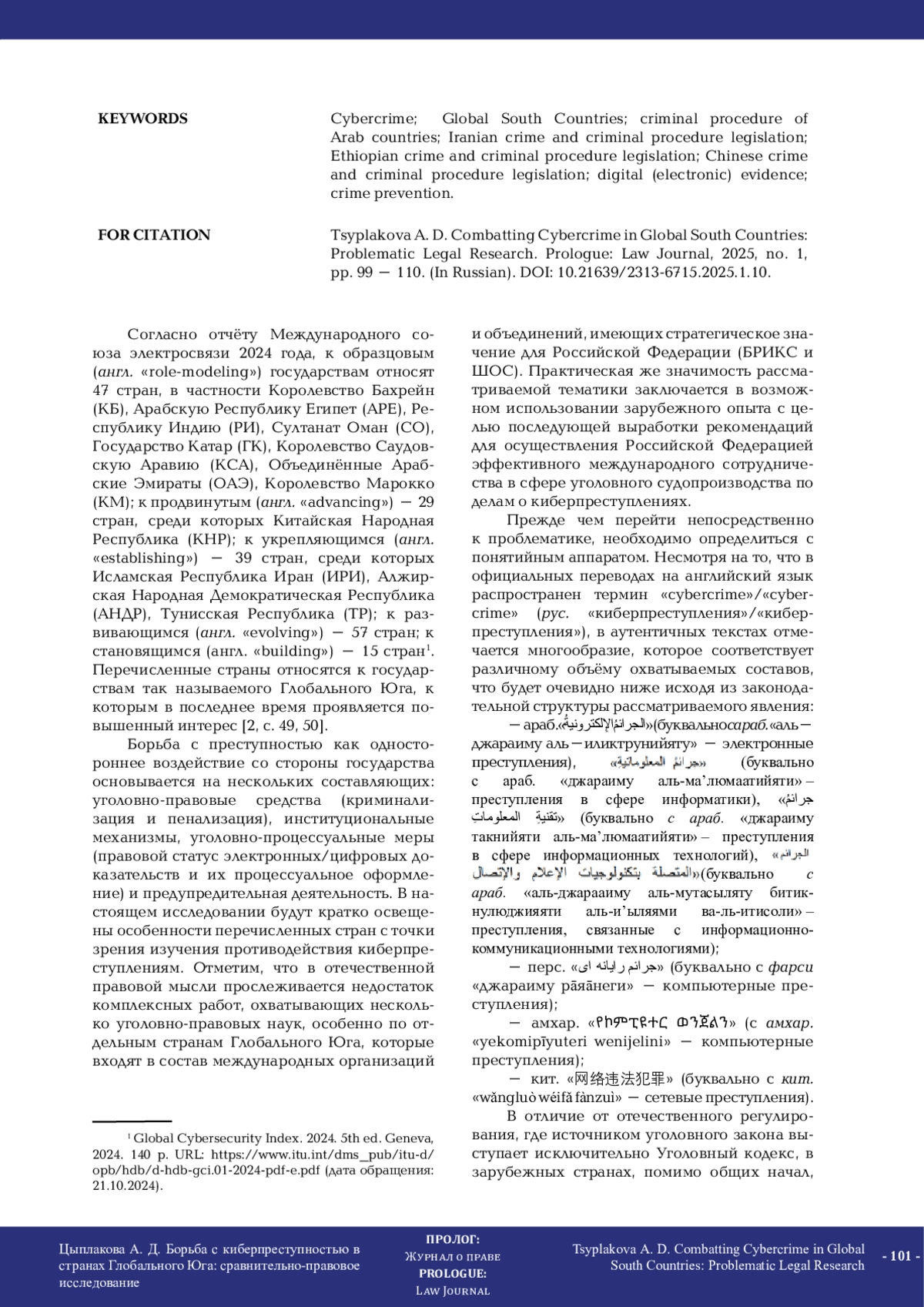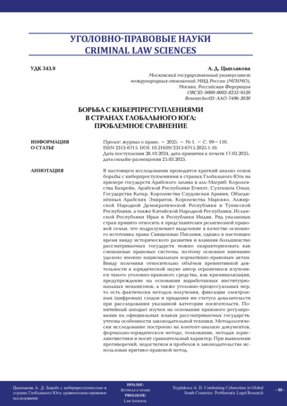 В настоящем исследовании проводится краткий анализ основ борьбы с киберпреступлениями в странах Глобального Юга на примере государств Арабского залива и аль-Магриб: Королевства Бахрейн, Арабской Республики Египет, Султаната Оман, Государства Катар, Королевства Саудовская Аравия, Объединённых Арабских Эмиратов, Королевства Марокко, Алжирской Народной Демократической Республики и Тунисской Республики, а также Китайской Народной Республики, Исламской Республики Иран и Республики Индия. Ряд указанных стран принято относить к представителям религиозной правовой семьи, что подразумевает выделение в качестве основного источника права Священные Писания, однако в настоящее время ввиду исторического развития и влияния большинство рассматриваемых государств можно охарактеризовать как смешанные правовые системы, поэтому основное внимание уделено именно национальным нормативно-правовым актам. Ввиду полемики относительно объёмов превентивной деятельности в юридической науке автор ограничился изучением такого уголовно-правового средства, как криминализация, предупреждение на основании выработанных институциональных механизмов, а также уголовно-процессуальных мер, то есть фактически методов получения, фиксации электронных (цифровых) следов и придания им статуса доказательств при расследовании указанной категории посягательств. Понятийный аппарат изучен на основании правового регулирования на официальных языках рассматриваемых государств, учтены особенности законодательной техники. Методологически исследование построено на контент-анализе документов, формально-юридическом методе, толковании, методах юрислингвистики и носит сравнительный характер. При выявлении противоречий, недостатков и пробелов в законодательстве использован критико-правовой метод.